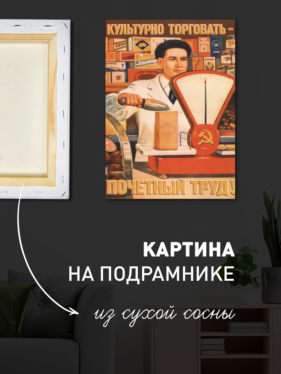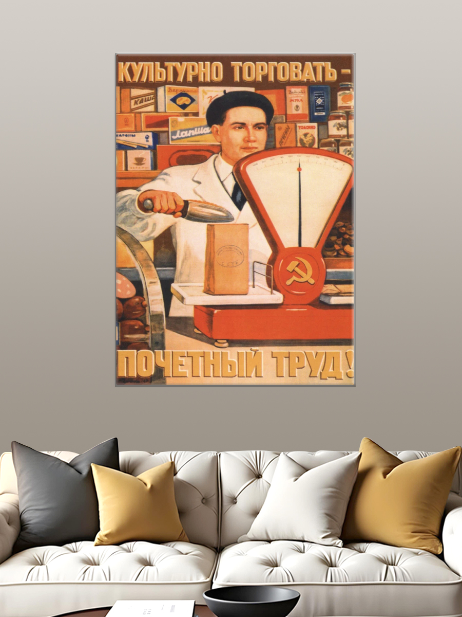 Описание: Картина 50 на 70 'Культурно торговать - Почетный труд!' представляет собой яркое и выразительное произведение, которое погружает зрителя в атмосферу советского времени, когда труд и культура торговли были неразрывно связаны. На картине изображен продавец, весы и разнообразные продукты на полках, что подчеркивает важность профессии и уважение к труду. Эта работа обладает уникальной способностью вызывать ностальгические чувства и гордость за трудовые достижения прошлого. Картина наполнена энергией, которая передается через яркие цвета и динамичные линии. Она вызывает эмоции уверенности, стабильности и уважения к традициям. Такое произведение станет отличным акцентом в любом интерьере, будь то кухня, столовая или рабочий кабинет. Оно может гармонично вписаться в стиль ретро или винтаж, а также добавить характер в современное пространство. 'Культурно торговать - Почетный труд!' не только украсит ваш дом, но и станет источником вдохновения, напоминая о ценности труда и важности культурных традиций.