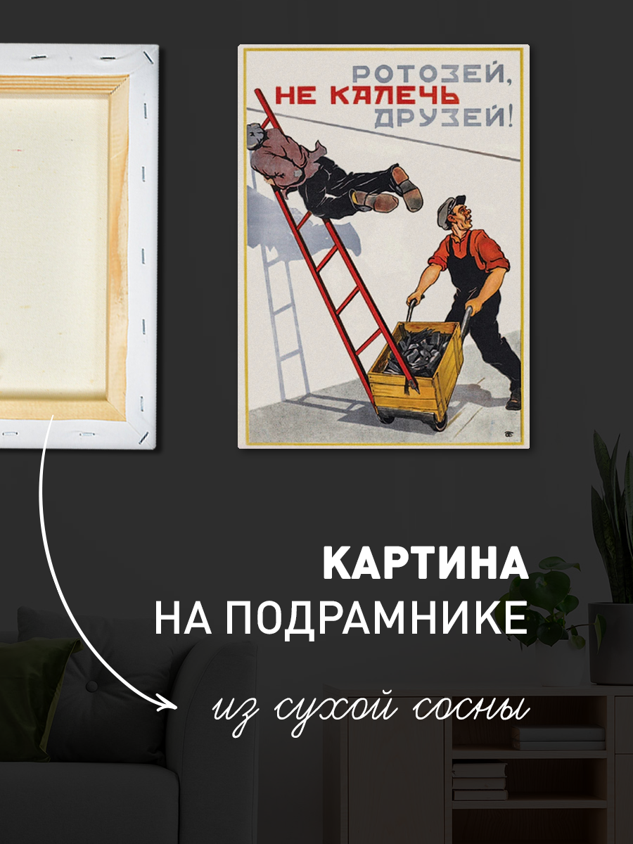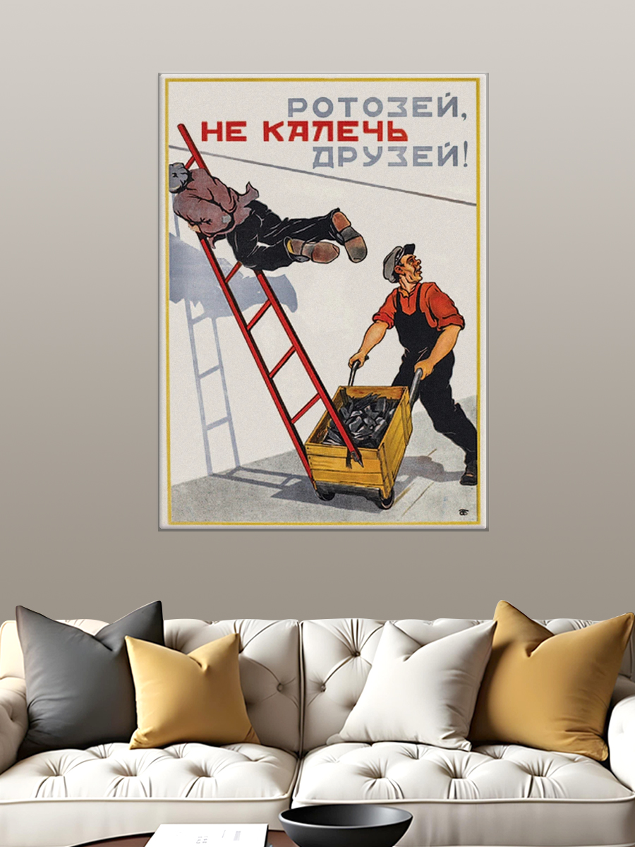Описание: Картина 50 на 70 "Ротозей, не калечь друзей!" - это выразительный плакат, который передает дух трудового подвига и коллективизма. На ней изображены рабочие, находящиеся в процессе работы, один из которых рискует, в то время как другой заботливо его поддерживает. Главная идея картины - подчеркнуть важность безопасности и взаимопомощи в коллективе, что делает её актуальной и в наши дни. Эта картина вызывает мощные эмоции: она вдохновляет на труд и напоминает о ценности дружбы и поддержки. Яркие цвета и динамичные линии привлекают внимание и создают атмосферу энергии и жизненной силы. Каждый раз, проходя мимо, вы будете ощущать прилив мотивации и уверенности в своих силах. Картина прекрасно впишется в рабочий офис, мастерскую или даже домашний кабинет, добавляя нотки вдохновения и напоминания о важности командной работы. Она также станет отличным подарком для людей, работающих в сфере производства или образования, где ценится труд и сотрудничество. Не упустите возможность сделать этот уникальный арт-объект частью вашего пространства!