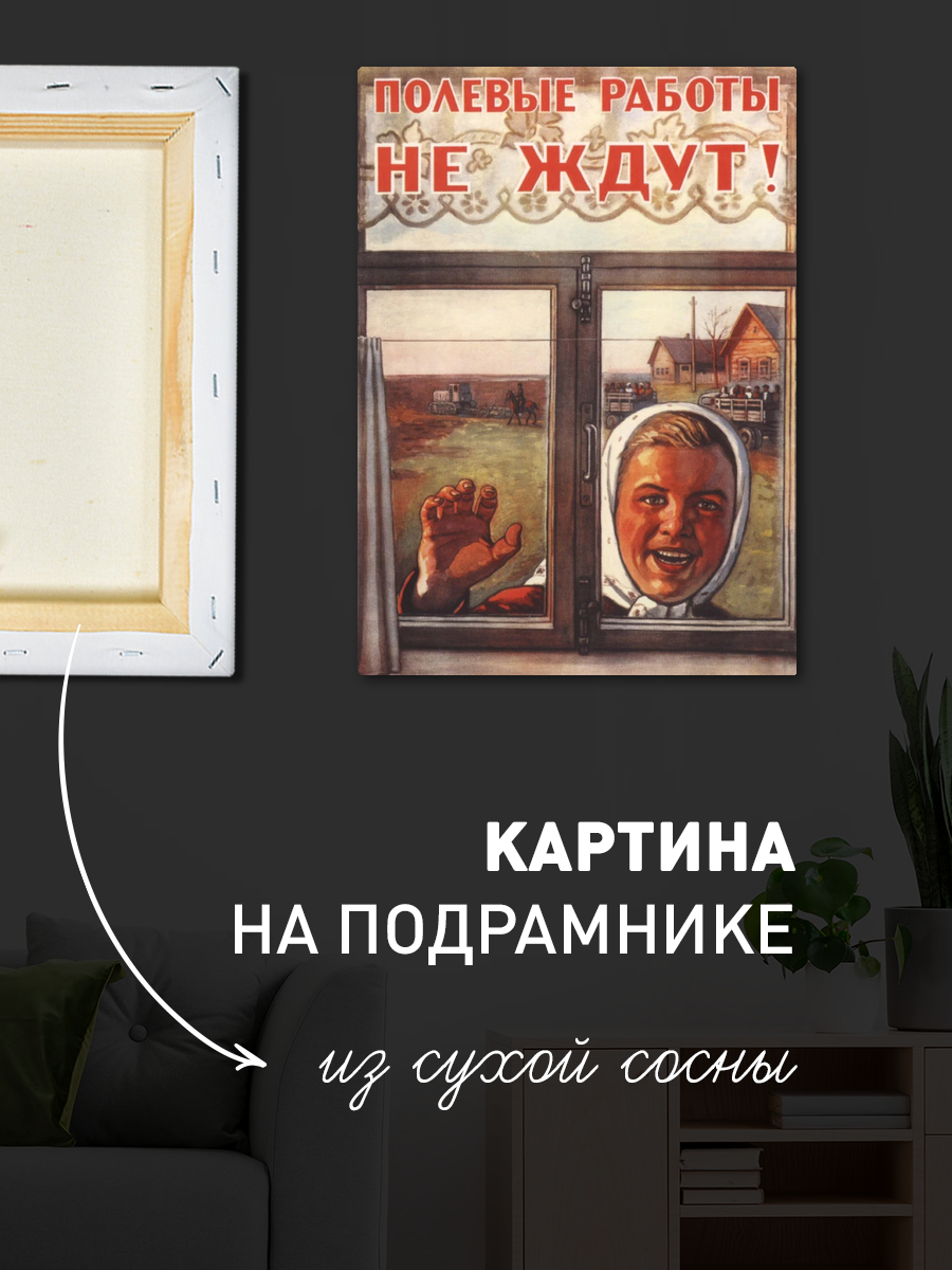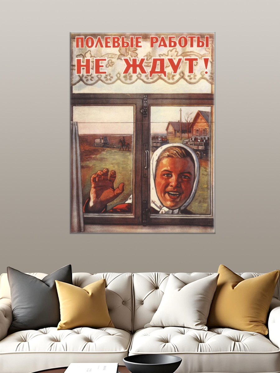 Описание: Картина 50 на 70 'Полевые работы не ждут!' представляет собой яркое изображение, запечатлевающее момент из сельской жизни. На картине изображен улыбающийся молодой человек, который смотрит через окно, приветствуя зрителя. За ним раскрывается живописный пейзаж с полями, домами и сельскохозяйственной техникой, что подчеркивает важность труда на земле. Основная идея картины — призыв к действию и напоминание о важности полевых работ, которые требуют немедленного внимания. Эта работа вызывает у зрителя теплые чувства и ностальгию по простым радостям жизни. Улыбка героя и его открытость внушают надежду и оптимизм, создавая ощущение близости к природе и ее красоте. Картина способна вызвать желание заниматься делами, которые действительно важны, и ценить труд людей. Картина отлично впишется в интерьер загородного дома, кухни или столовой, создавая атмосферу уюта и тепла. Она также будет замечательным дополнением для офисного пространства, напоминая о важности работы и стремлении к результату. 'Полевые работы не ждут!' станет не только украшением вашего дома, но и источником вдохновения для всех, кто на нее смотрит.