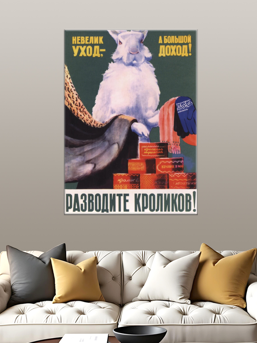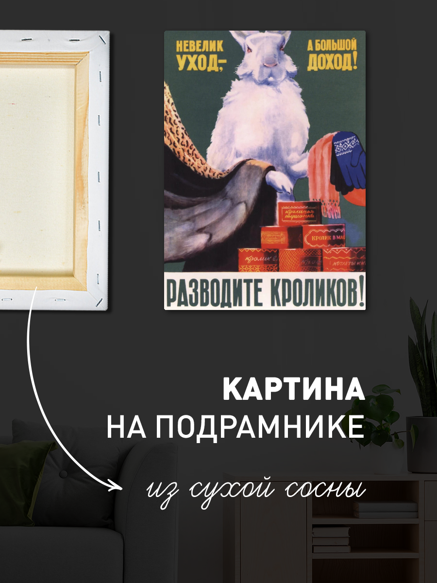 Описание: Картина 50 на 70 "Разводите кроликов!" представляет собой яркий и запоминающийся натюрморт, на котором изображен белый кролик, окруженный упаковками с изображением кроликов. Основная идея этой картины заключается в пропаганде разведения кроликов как прибыльного занятия. Уникальность картины заключается в её ретро-стиле и выразительном образе кролика, который привлекает внимание и вызывает интерес. Эта работа вызывает чувство ностальгии и радости, напоминая о простых радостях жизни и возможностях, которые она может предложить. Её яркие цвета и забавный сюжет способны поднять настроение и добавить уют в любое пространство. Картина отлично подойдет для кухни, столовой или рабочего кабинета, где она сможет стать акцентом, вызывающим улыбку и положительные эмоции. Также она будет прекрасным подарком для любителей природы и животных. Повесьте её на видное место, и она станет настоящим украшением интерьера, стимулируя разговоры и вдохновляя на новые идеи.