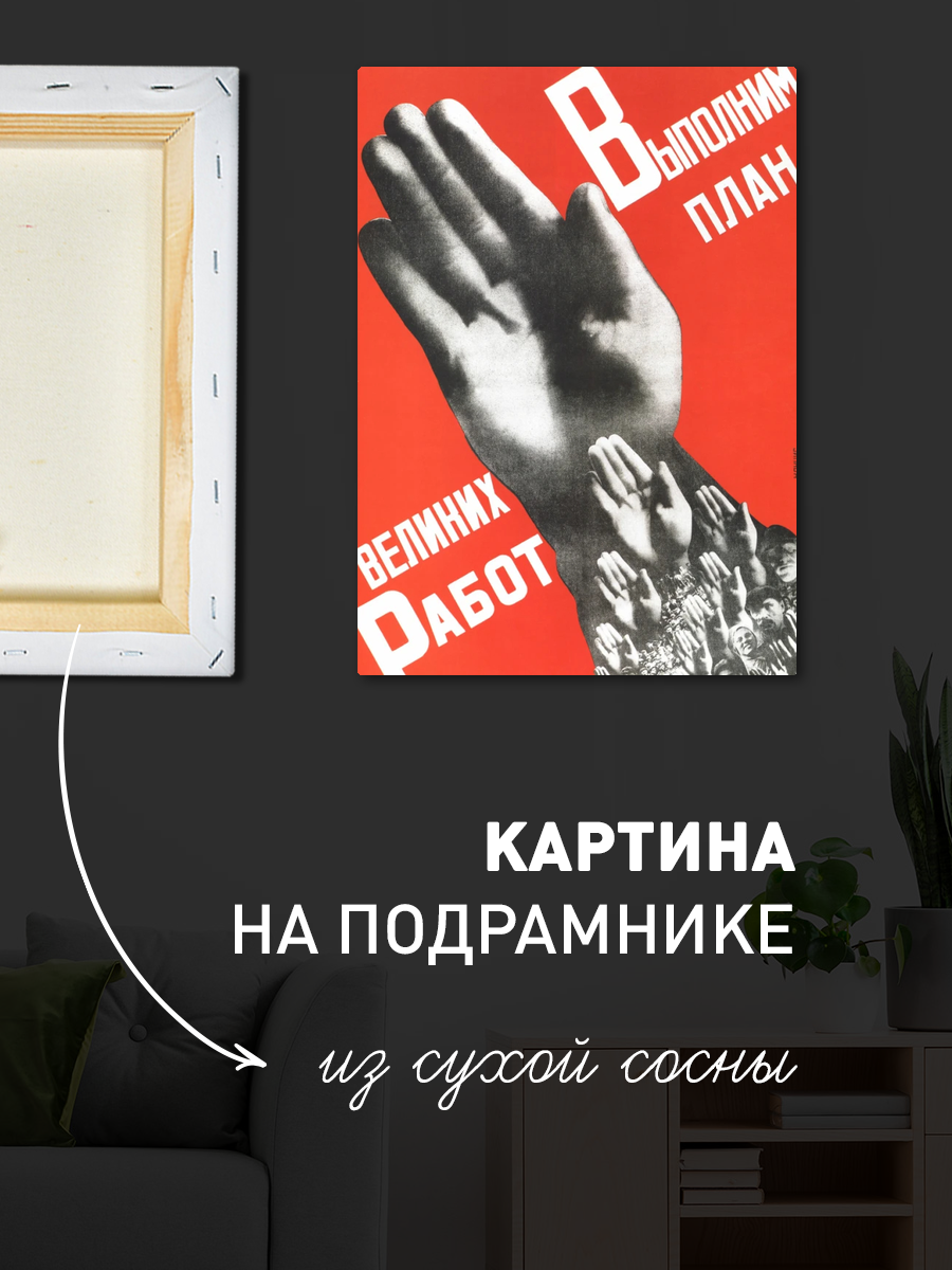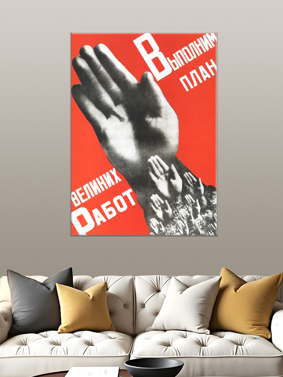 Описание: Картина 50 на 70 "Выполним план" представляет собой яркий и запоминающийся плакат, выполненный в стиле советского авангарда. На фоне насыщенного красного цвета изображены руки, поднимающиеся к небу, символизируя единство и стремление к выполнению больших задач. Основная идея картины заключается в вдохновении и мотивации, призывающей зрителей к действию и совместным усилиям в достижении целей. Эта картина вызывает сильные эмоции — чувство надежды, силы и решимости. Она наполняет пространство энергией, побуждая к действию и позитивному мышлению. Каждый раз, глядя на нее, вы будете ощущать прилив сил и желание двигаться вперед, что делает ее идеальным дополнением к любому интерьеру. Картина прекрасно впишется в офисное пространство, домашний кабинет или студию, где требуется вдохновение и мотивация. Также она станет отличным акцентом в интерьере, оформленном в минималистичном или индустриальном стиле. Подвесив ее на стену, вы добавите нотку креативности и оригинальности в ваше пространство, создавая атмосферу, способствующую работе и самосовершенствованию.