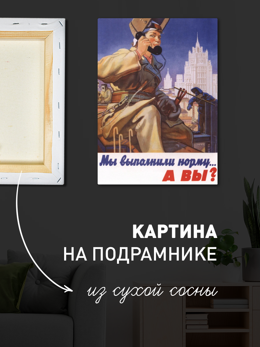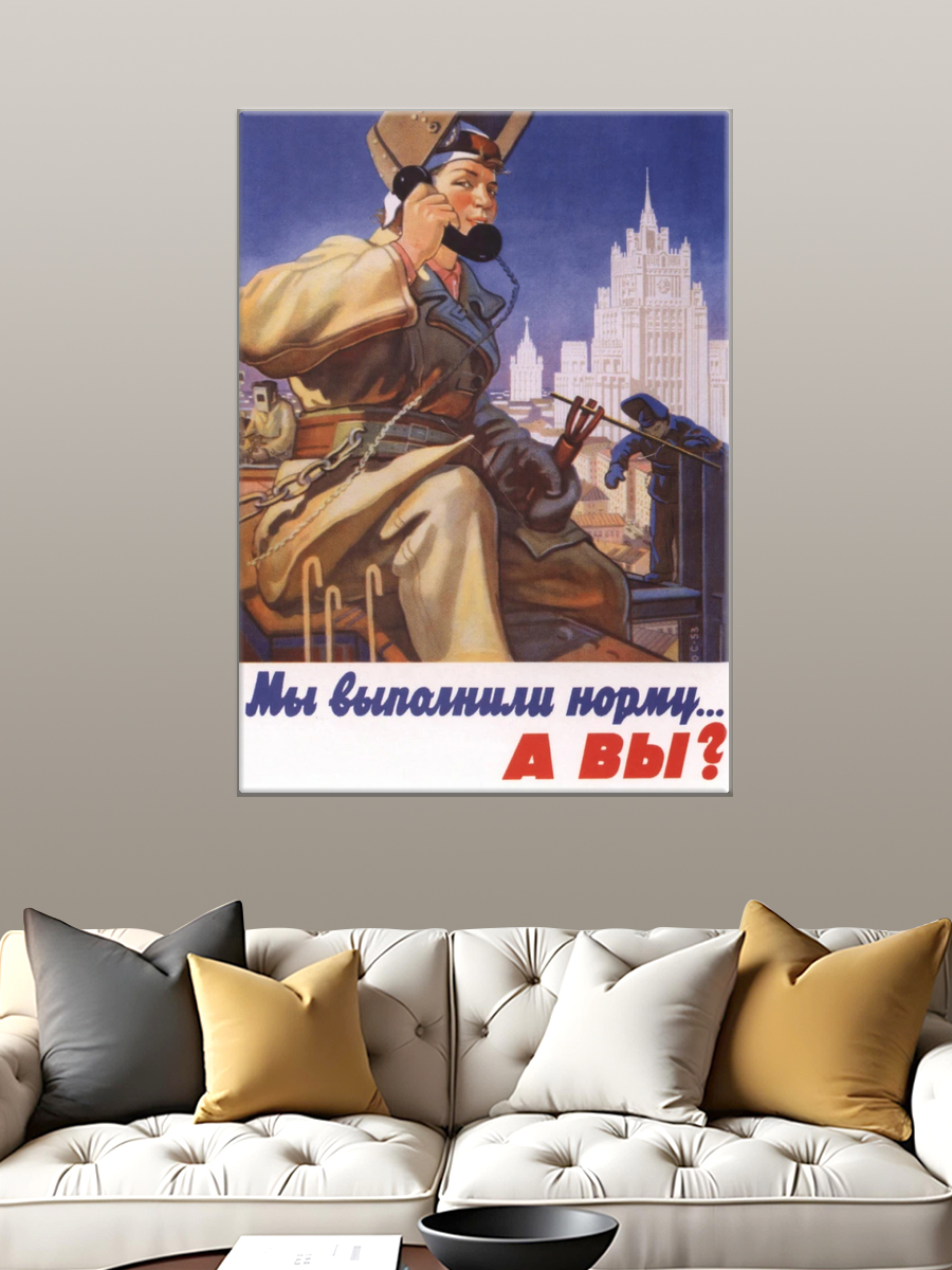 Описание: Картина 50 на 70 "Мы выполнили норму... А вы?" представляет собой яркий и вдохновляющий образ, передающий дух труда и преданности делу. На картине изображена женщина в рабочей одежде, говорящая по телефону на фоне величественного городского пейзажа. Ее уверенное выражение лица и динамичная поза подчеркивают силу и решительность, а символика труда и достижения вызывает чувство гордости и мотивации. Уникальность произведения заключается в его способности передать атмосферу времени, когда каждый вклад был важен для построения будущего. Картина вызывает позитивные эмоции, наполняя пространство ощущением надежды и энергии. Она станет отличным акцентом в интерьере, добавляя нотку ретро и вдохновения в офис, студию или уютный уголок дома. Благодаря своим выразительным цветам и значимой идее, данное произведение легко впишется в различные стили оформления, начиная от современного и заканчивая классическим, придавая помещению особую атмосферу.