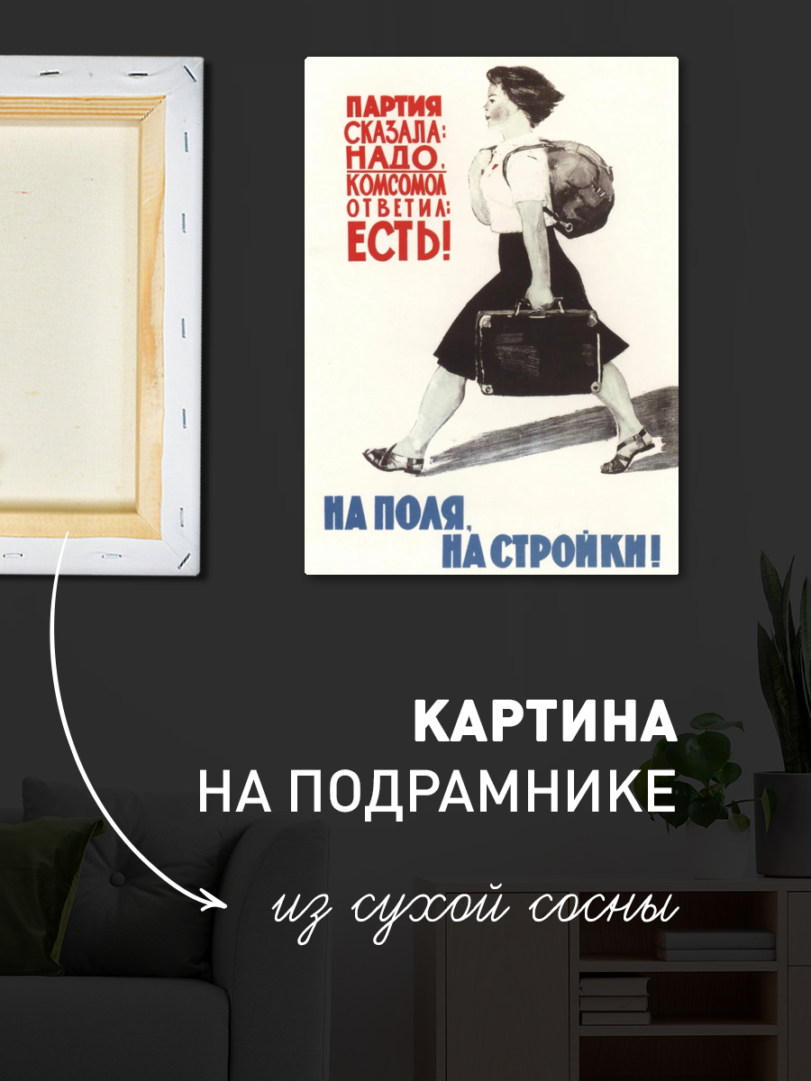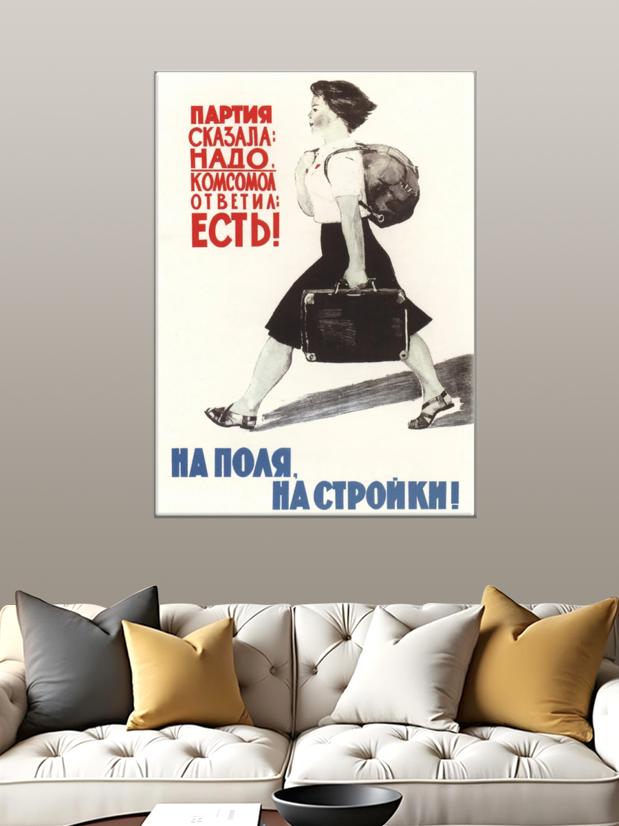 Описание: Картина 50 на 70 "Партийный призыв" представляет собой яркий и выразительный плакат, на котором изображена молодая женщина, уверенно шагающая вперёд с чемоданом в руках. Основная идея картины заключается в призыве к действию и готовности к трудовым свершениям, что было особенно актуально в советское время. Эта работа уникальна не только своим историческим контекстом, но и эмоциональной насыщенностью: она вдохновляет на смелые поступки и преодоление трудностей. Картина вызывает чувство уверенности и оптимизма, наполняя пространство энергией и решимостью. Она может стать отличным акцентом в любом интерьере, добавляя в него нотки ретро и исторической значимости. "Партийный призыв" отлично впишется в офисное пространство, где требуется мотивация и вдохновение, или в домашний кабинет, создавая атмосферу целеустремлённости. Также она подойдет для творческих пространств, таких как студии и мастерские, где важно ощущение движения вперёд и стремление к новым вершинам. Благодаря своей выразительной палитре и динамике, картина будет привлекать взгляды и вызывать интерес у гостей, выступая в роли не только декора, но и источника вдохновения.
