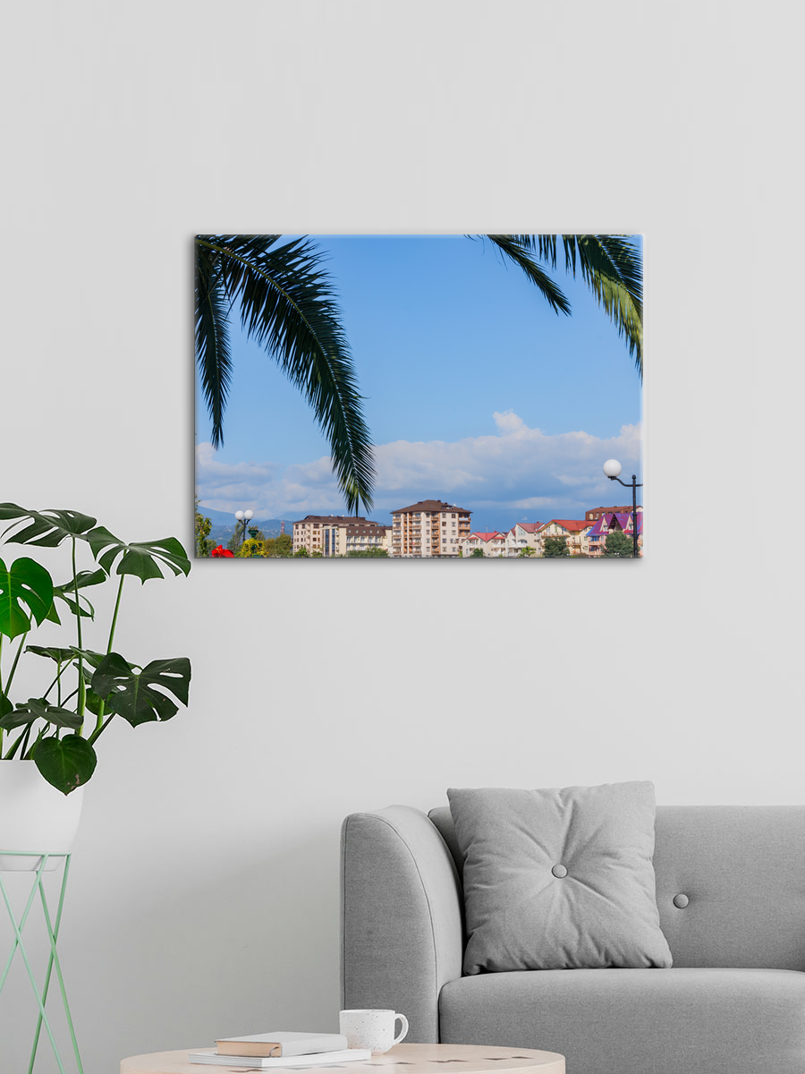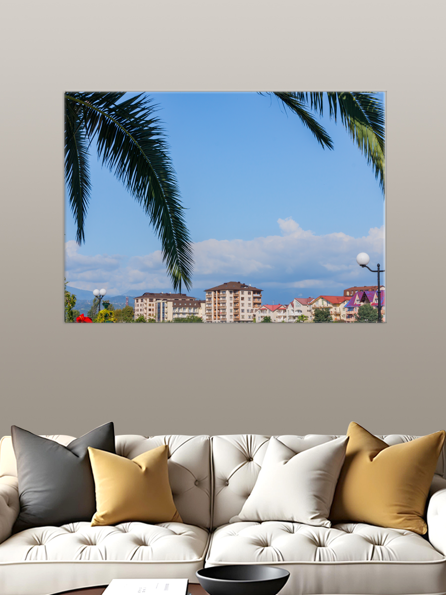 Описание: Картина 50 на 70 "Летний курорт" изображает живописный пейзаж с пальмами на фоне яркого голубого неба и величественных облаков. В центре композиции уютные многоэтажные здания, создающие атмосферу спокойствия и уюта. Эта картина передает ощущение безмятежности и радости, вызывая в зрителе воспоминания о летнем отдыхе и солнечных днях. Уникальность картины заключается в её способности перенести вас в мир тропического рая, наполняя ваш дом светом и теплом. Эмоции, которые вызывает данное произведение, помогают ощутить свежесть морского бриза и наслаждение моментами отдыха. Она может стать центром внимания в любом интерьере, наполняя пространство позитивной энергией. Картина идеально подойдет для оформления гостиной, спальни или кафе, создавая атмосферу расслабления и уюта. Также её можно разместить в офисе, чтобы добавить нотку вдохновения и гармонии в рабочую обстановку. Каждое утро, просыпаясь и смотря на эту картину, вы будете чувствовать себя ближе к летнему солнцу и расслабляющим пляжу.