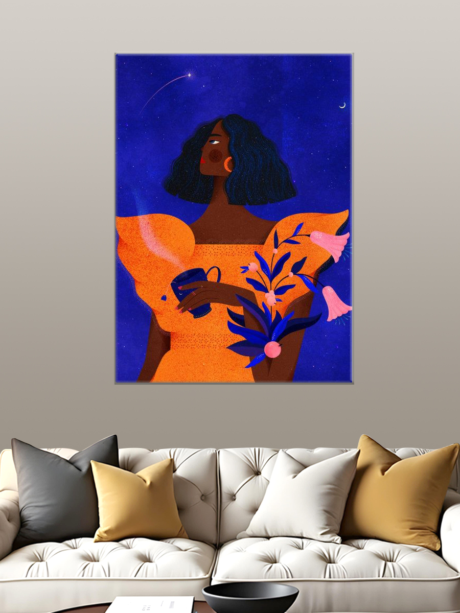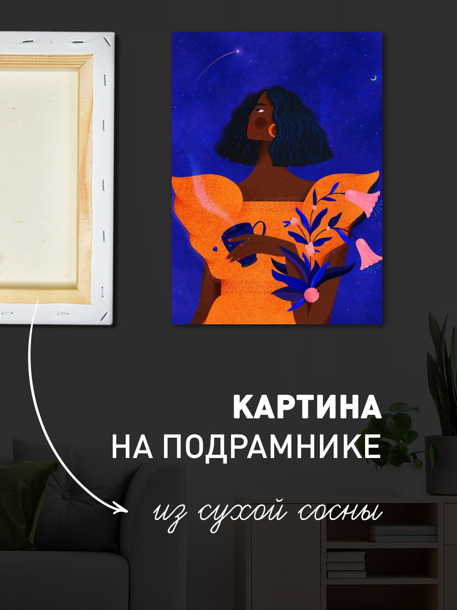 Описание: Картина 50 на 70 "Женская гармония" представляет собой яркое и вдохновляющее изображение женщины, окруженной элементами природы. На картине преобладают теплые оранжевые и синие оттенки, создающие контраст, который привлекает внимание. Основная идея картины заключается в выражении внутренней силы и красоты, а также в соединении человека с природой. Эта работа уникальна своим стилем и передачей эмоций, что делает её идеальным акцентом для любого интерьера. Картина вызывает чувства спокойствия и умиротворения, наполняя пространство теплом и светом. Она может стать центром внимания в гостиной, спальне или кабинете, создавая атмосферу уюта и вдохновения. Благодаря своему яркому цвету и оригинальному дизайну, она прекрасно дополнит как современные, так и классические интерьеры. П hanging this artwork in your home not only enhances the aesthetic appeal of the room but also invites positive energy and creativity into the space. The balanced composition and harmonious colors make it a versatile piece that fits well in various settings, whether it be a cozy reading nook, an artistic studio, or a vibrant living room. Let "Женская гармония" transform your walls and uplift your spirit.