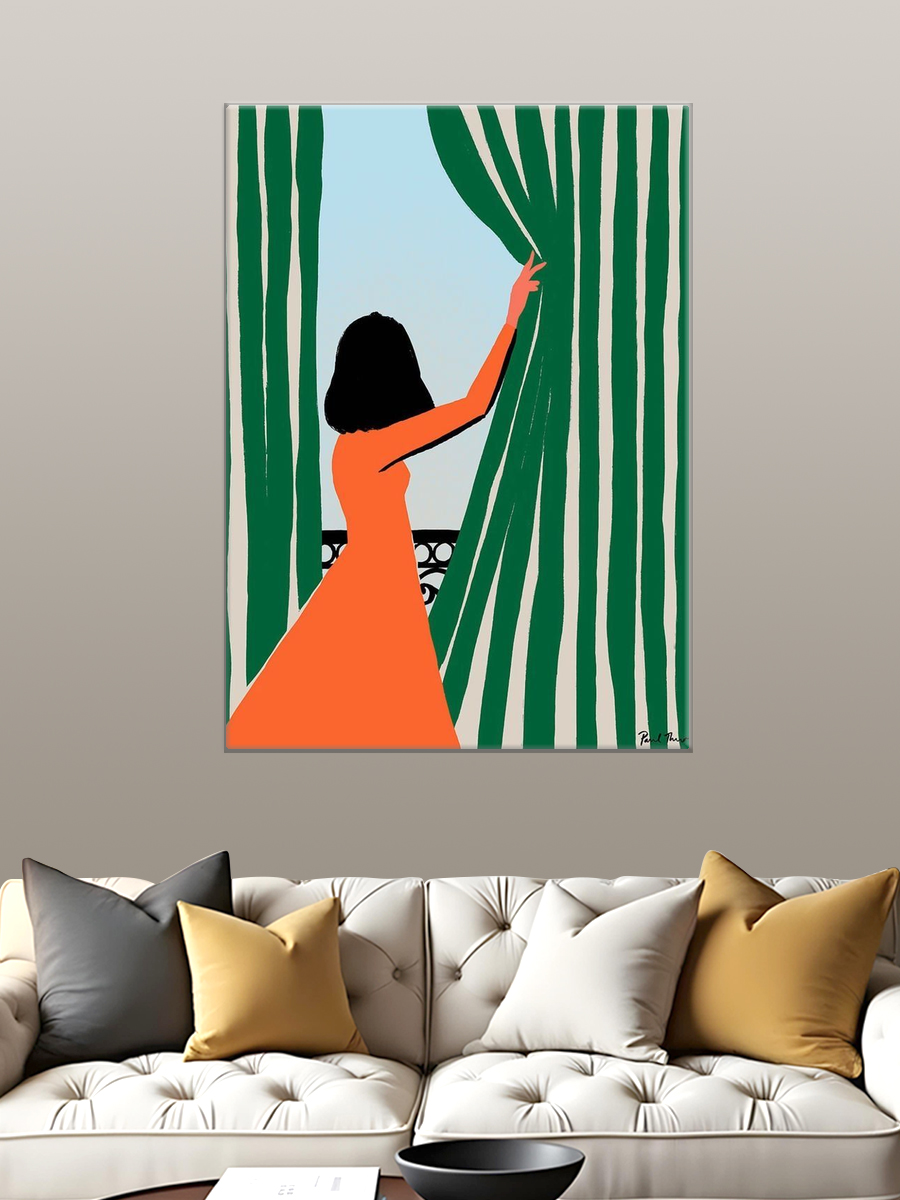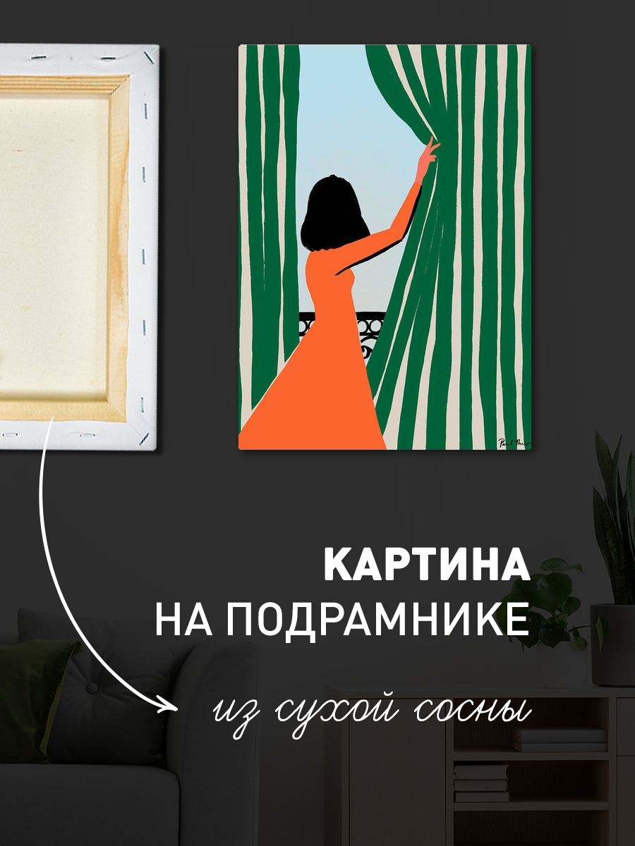 Описание: Картина 50 на 70 "Заглядывая в мир" изображает силуэт женщины, которая осторожно приоткрывает занавес, позволяя свету проникнуть в пространство. Основная идея картины — это момент ожидания и открытости к новому. Уникальность работы заключается в контрасте яркого оранжевого платья с насыщенно зелеными занавесками, что создает ощущение теплоты и уюта. Эта картина вызывает чувства спокойствия и надежды, даря зрителю возможность задуматься о том, что за горизонтом. Она идеально впишется в интерьер гостиной, спальни или кабинета, добавляя яркий акцент и атмосферу. Благодаря своим гармоничным цветам и выразительной композиции, "Заглядывая в мир" станет замечательным дополнением вашего дома, создавая уют и вдохновляя на новые идеи.