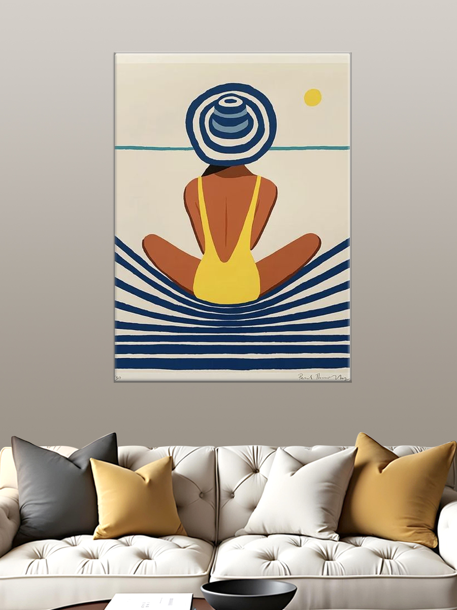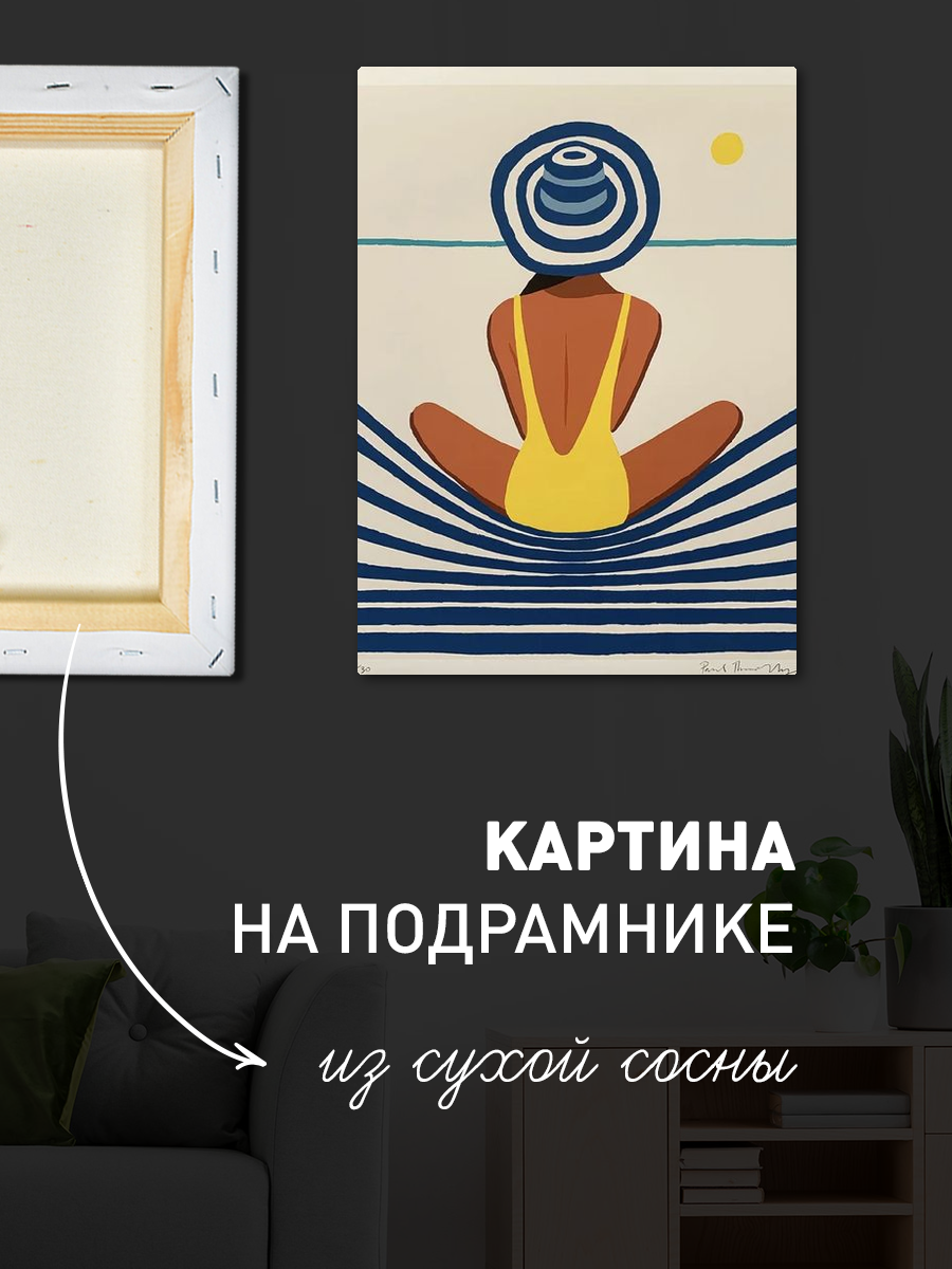 Описание: Картина 50 на 70 "Летний отдых" изображает женщину, сидящую на пляже с ярким желтым купальником и стильной полосатой шляпой. Она смотрит на спокойное море, а над ней светит теплое солнце. Основная идея картины — передать атмосферу безмятежности и радости летнего отдыха. Уникальность этого произведения заключается в смелых цветах и простых, но выразительных формах, которые дарят ощущение тепла и уюта. Эта картина вызывает положительные эмоции, напоминая о беззаботных летних днях, когда время как будто останавливается. Она приносит в дом атмосферу спокойствия и расслабления, позволяя каждому взгляду на неё ощутить легкость и радость. Картина идеально подойдет для интерьеров в стиле минимализм, скандинавском или современном. Её можно повесить в гостиной, кабинете или даже в спальне, чтобы создать атмосферу уюта и спокойствия. Яркие цвета картины привнесут живость в любое пространство, делая его более дружелюбным и теплым.