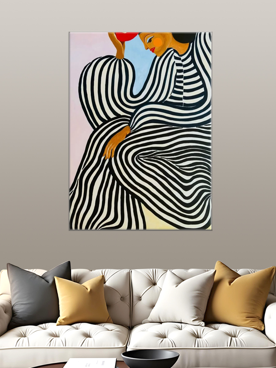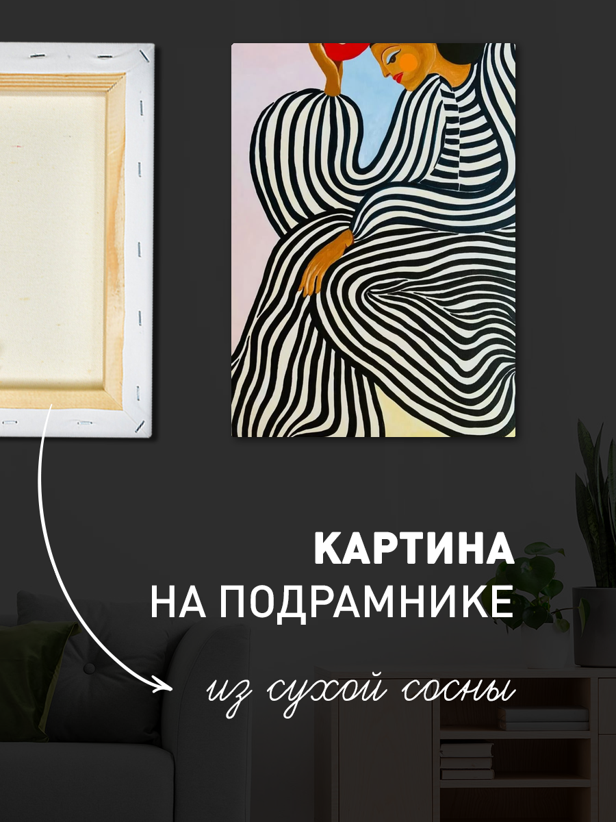Описание: Картина 50 на 70 "Название картины" представляет собой яркое и выразительное произведение искусства, на котором изображена женщина в стильной полосатой одежде. Основная идея картины заключается в передаче женственности и грации через активные линии и контрастные цвета. Уникальность этого произведения заключается в мастерском сочетании черно-белых полос, которые создают ощущение движения и динамики, а также в использовании красного акцента, который привлекает внимание и добавляет эмоциональную насыщенность. Эта картина вызывает теплые и позитивные чувства, напоминая о красоте и силе женской природы. Она может стать настоящим акцентом в вашем интерьере, привнося в него нотки стиля и современности. Благодаря своему выразительному дизайну, картина идеально подойдет для различных пространств: от уютной гостиной и спальни до стильного офисного кабинета. Размещение этой картины на стене придаст комнате особое очарование и создаст атмосферу комфорта и вдохновения. Она будет замечательно смотреться как в классическом, так и в современном интерьере, добавляя ему индивидуальности и шарма.