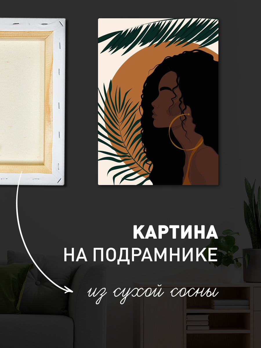 Описание: Картина 50 на 70 "Загадочная красота" представляет собой изысканное изображение силуэта женщины с пышными кудрями, окруженной тропическими листьями. Эта работа передает атмосферу спокойствия и внутренней силы, подчеркивая природную красоту. Уникальность картины заключается в гармоничном сочетании теплых и холодных оттенков, которые создают ощущение уюта и комфорта. Каждый элемент картины вызывает множество эмоций: от восхищения природой до чувства умиротворения. Она наполняет пространство легкостью и свежестью, позволяя зрителю погрузиться в мир гармонии. Эта картина станет настоящим акцентом в вашем интерьере, идеально вписываясь в стиль скандинавского, бохо или современного дизайна. Она подойдет для спальни, гостиной или кабинета, добавляя нотку элегантности и индивидуальности. Повесьте ее на стену, и она станет не только украшением, но и источником вдохновения, напоминая о красоте и силе природы.