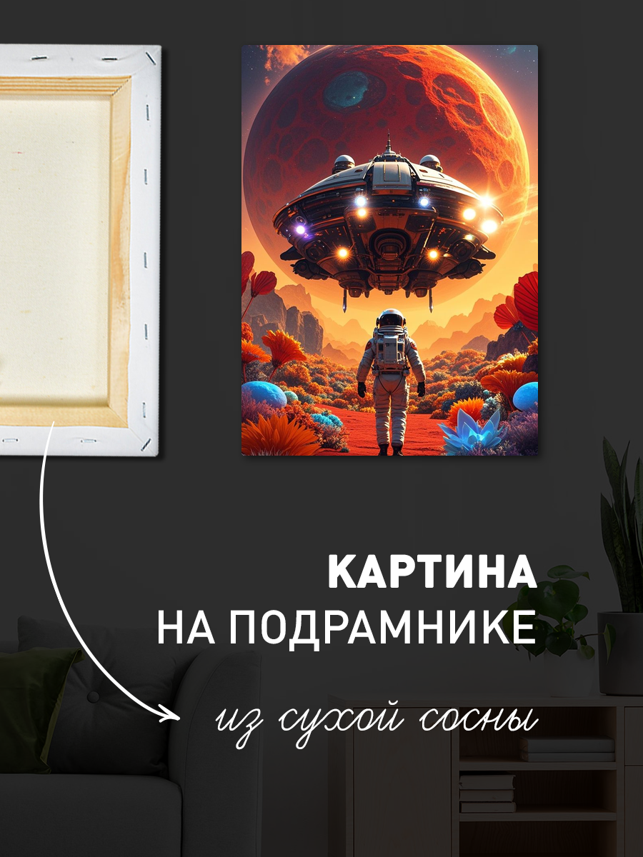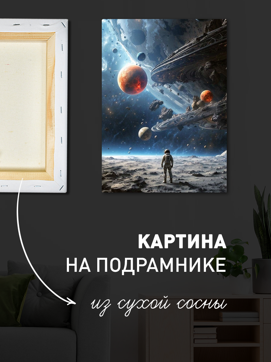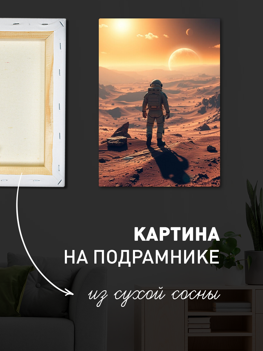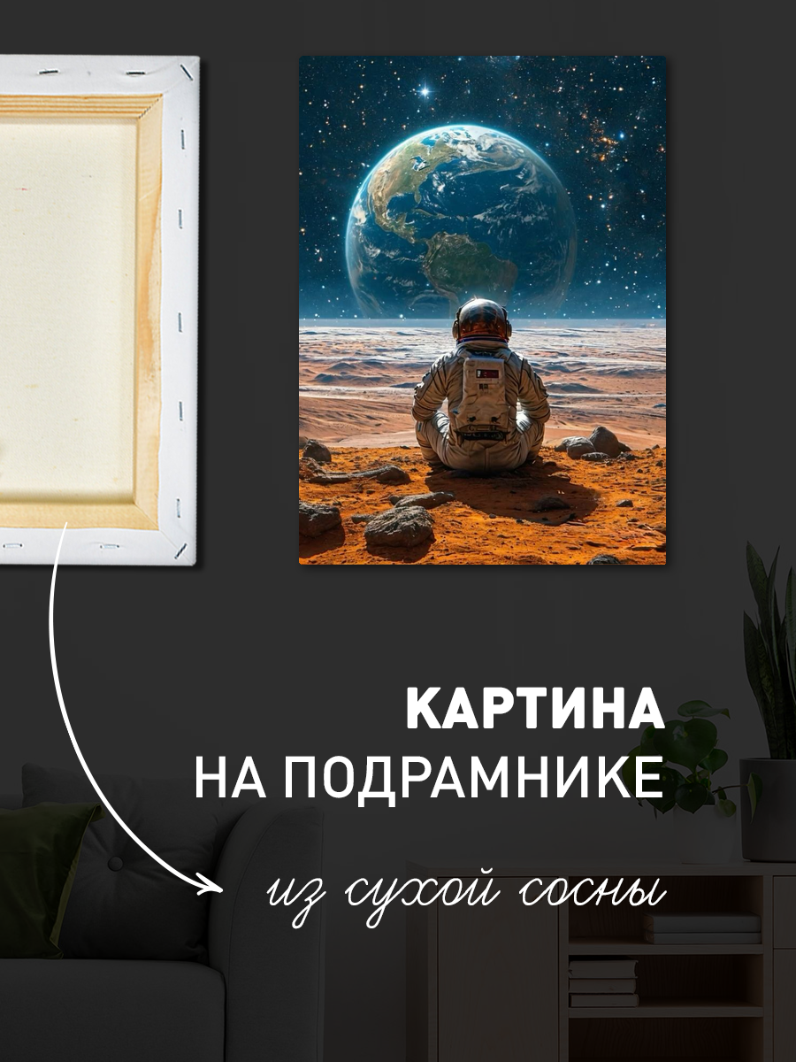 Описание: Картина 50 на 70 "Космическое созерцание". Эта удивительная работа изображает астронавта, сидящего на марсианской поверхности и созерцающего нашу Землю вдалеке, окруженную звёздами. Основная идея картины — это исследование и одиночество, момент тишины и размышлений в бескрайних просторах космоса. Уникальность заключается в комбинировании реалистичного изображения астронавта с абстрактным космическим фоном, создающим ощущение безмятежности и величия. Эта картина вызывает глубокие эмоции: она пробуждает чувства восхищения и стремления к открытиям, заставляет задуматься о месте человека во Вселенной. Вы будете чувствовать спокойствие и вдохновение, глядя на неё, как будто она переносит вас в другие миры и заставляет мечтать о новых горизонтах. Картина идеально впишется в современный интерьер: её можно разместить в гостиной, кабинете или спальне, добавив нотки космической тематики и стиля. Она станет отличным акцентом в любом пространстве, подчеркивая индивидуальность и вкус владельца. Не упустите возможность украсить свой дом этой вдохновляющей работой, которая будет радовать глаз и напоминать о бесконечных возможностях нашего мира.