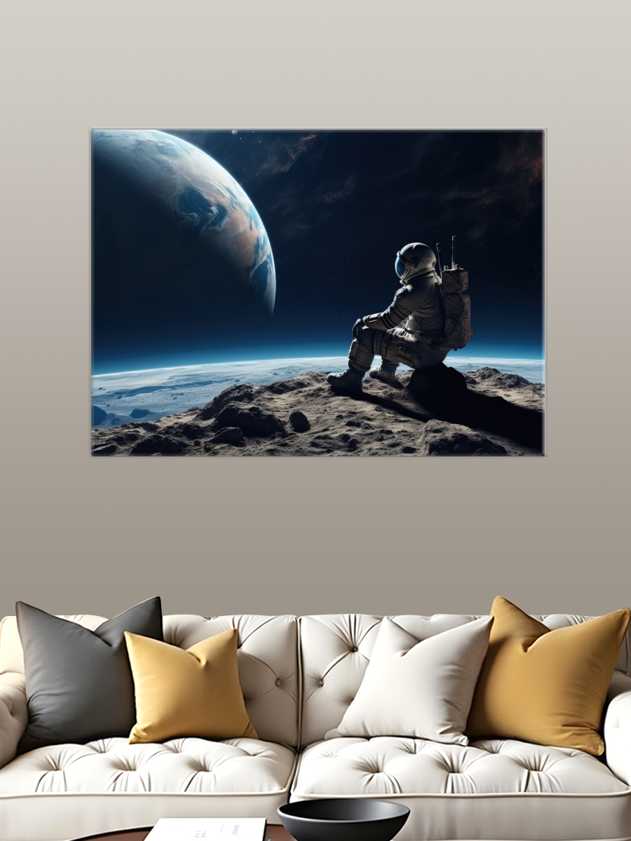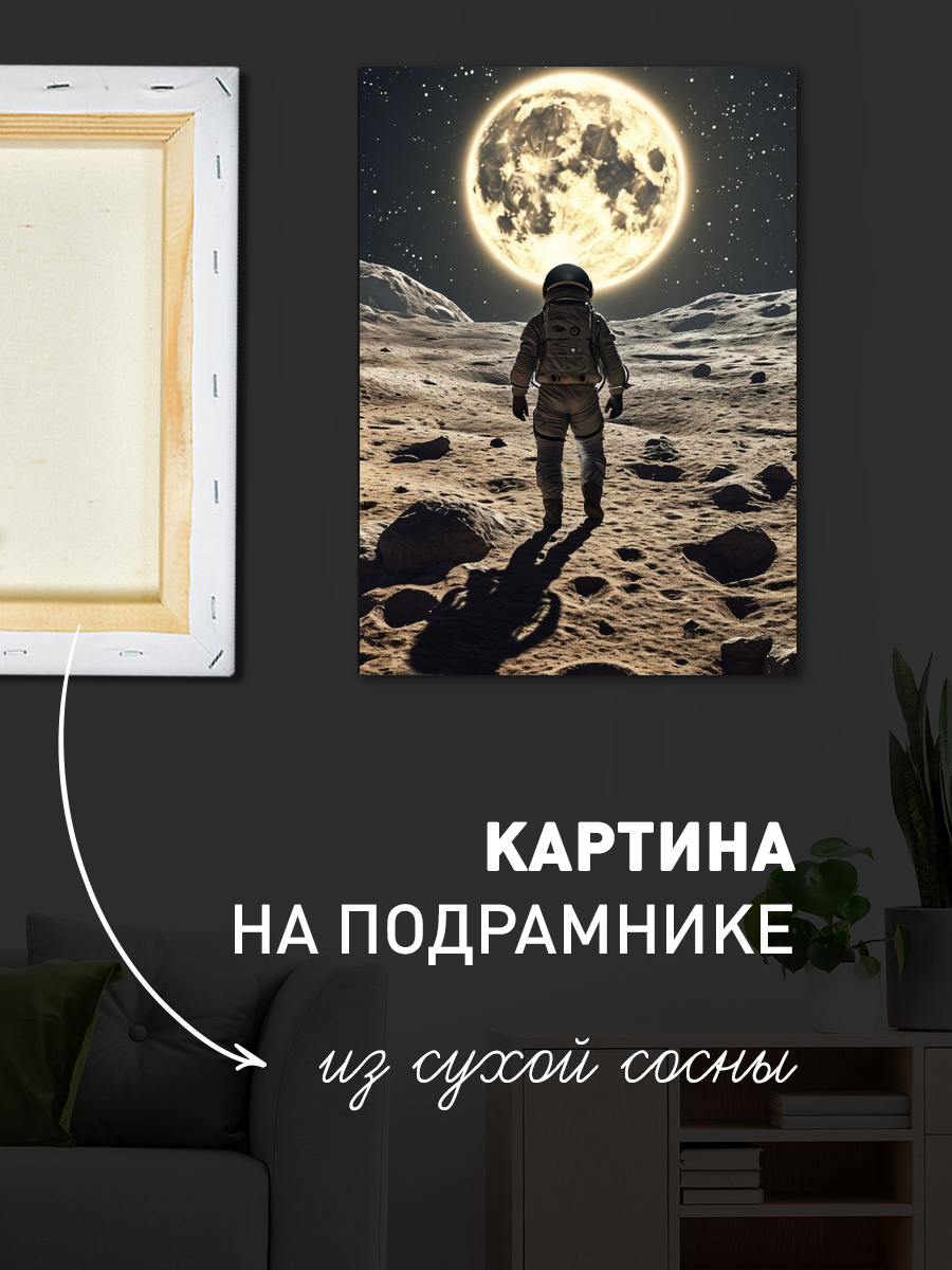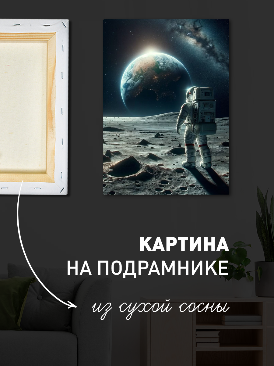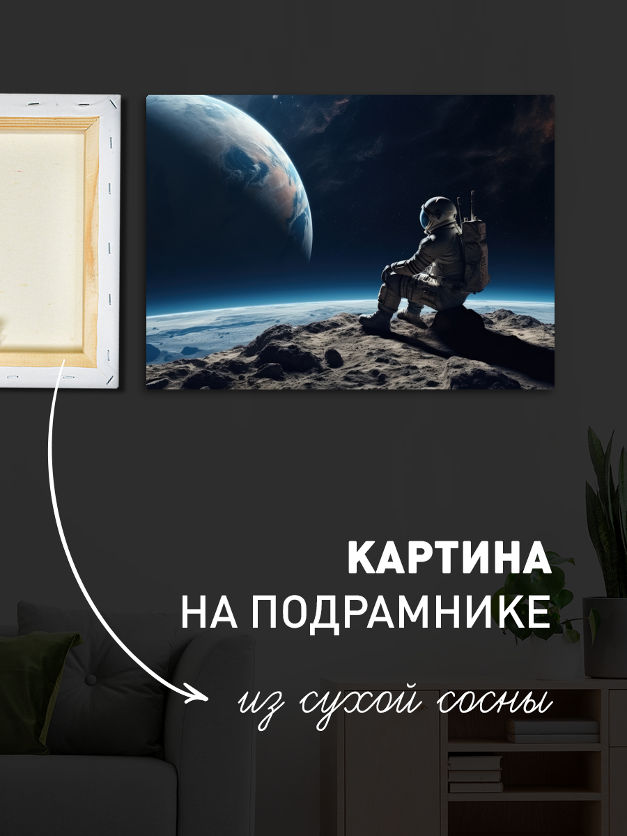Описание: Картина 50 на 70 'Тишина космоса' изображает астронавта, сидящего на поверхности луны, с завораживающим видом на Землю. Основная идея этой картины — передать ощущение одиночества и величия космоса, показывая, как человек может быть одновременно мал и велик в бескрайних просторах Вселенной. Уникальность картины заключается в мастерском сочетании цветовых оттенков, передающих глубину пространства и атмосферу безмолвия. Картина вызывает чувства спокойствия и размышлений, погружая зрителя в мир космических просторов и оставляя место для собственных интерпретаций. Она может стать источником вдохновения и размышлений о месте человека в бесконечном космосе. Эта работа идеально подойдет для современного интерьера, добавляя нотку загадочности и стиля. Она станет замечательным акцентом в кабинете, гостиной или спальне, создавая атмосферу уединения и спокойствия. Такой арт-объект также будет уместен в офисах и пространствах, связанных с наукой и инновациями, напоминая о стремлении к новым открытиям. Картина 'Тишина космоса' станет не только элементом декора, но и символом мечты и стремления к неизведанному.