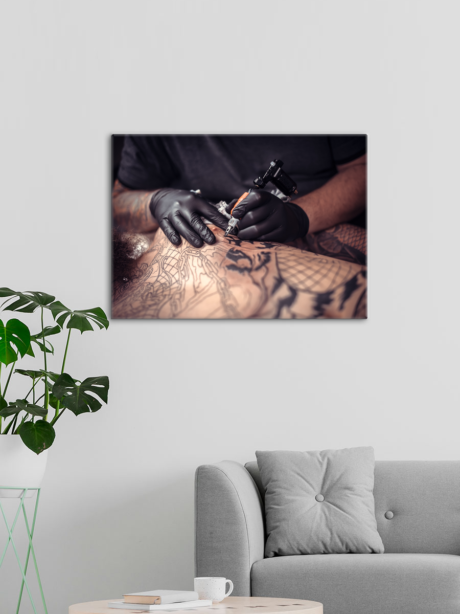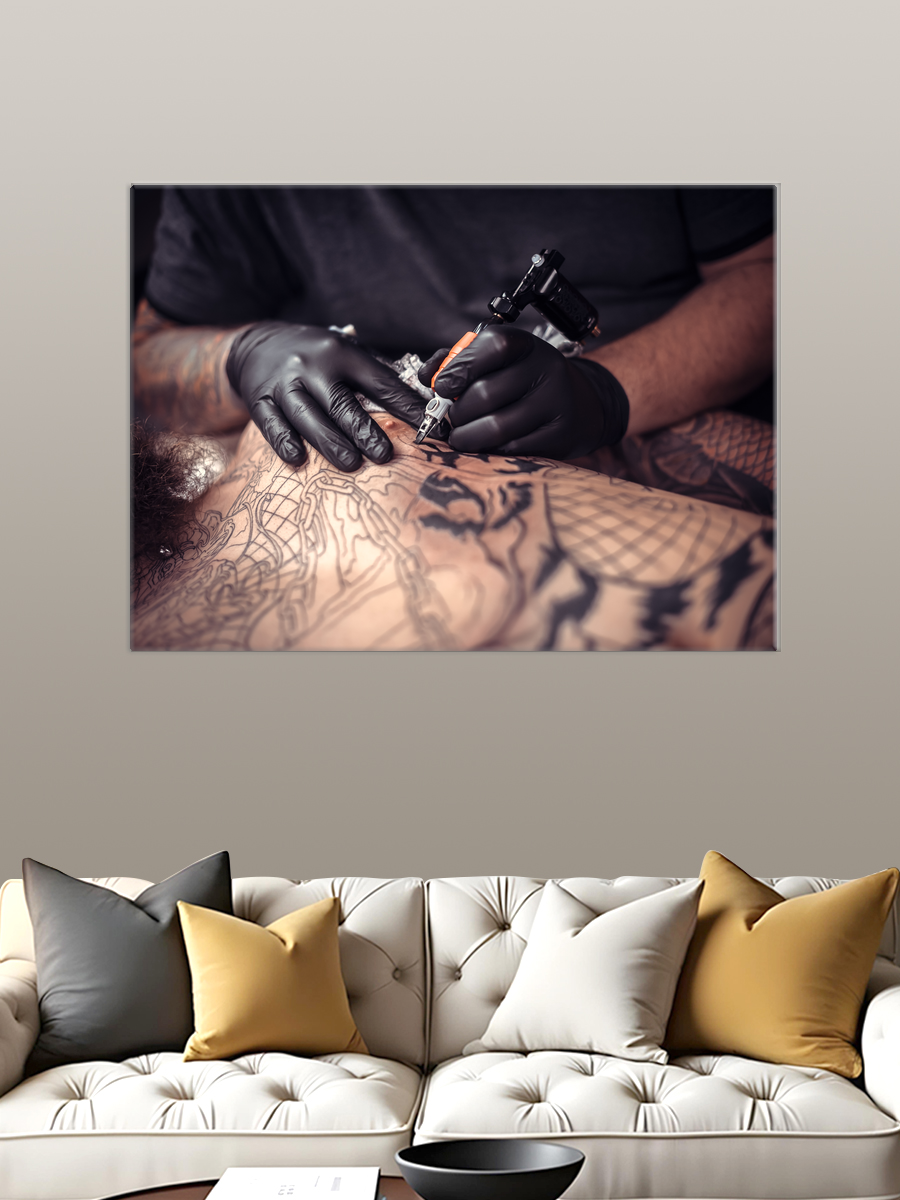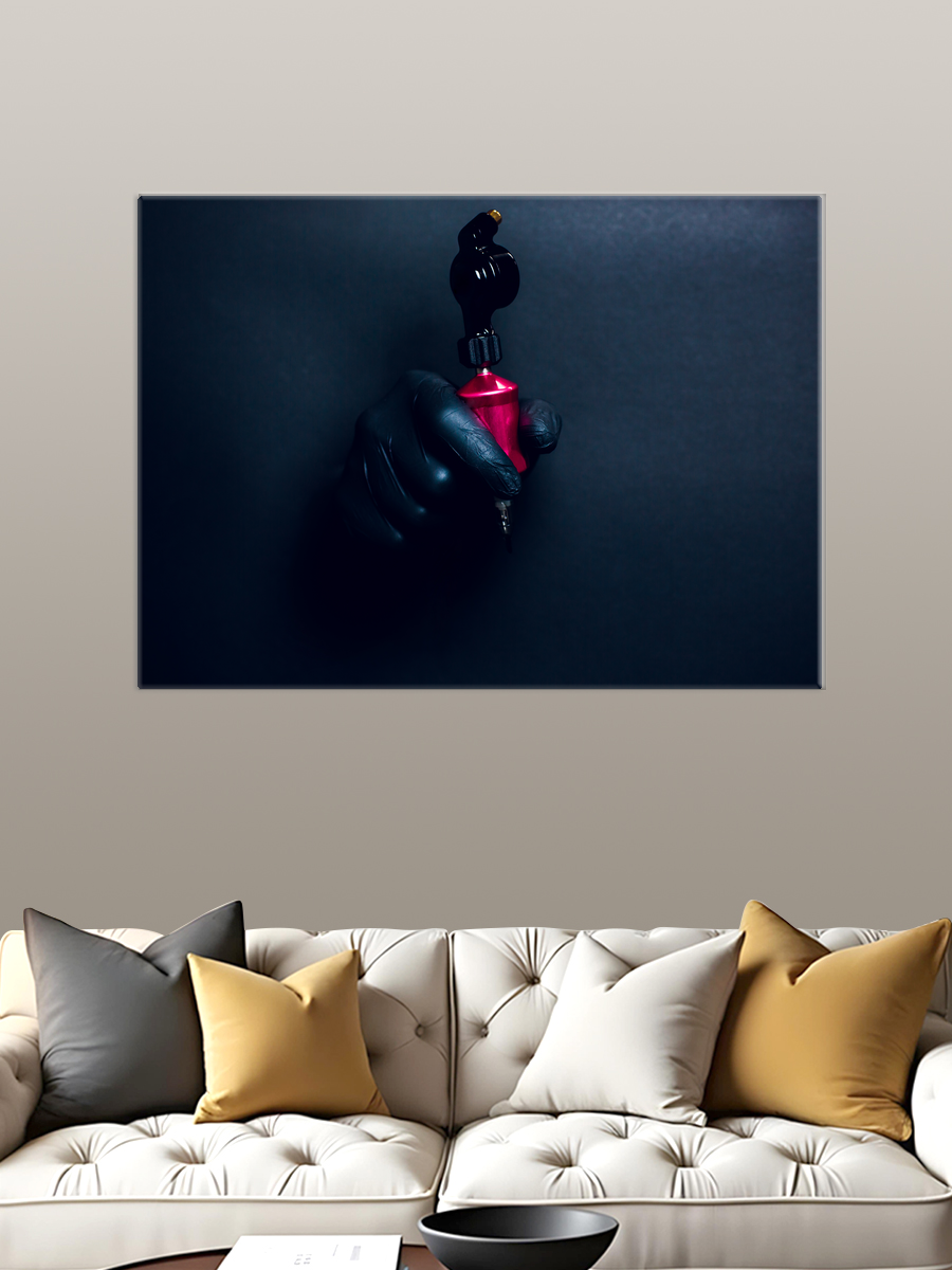 Описание: Картина 50 на 70 "Татуировка в действии" представляет собой захватывающее изображение, на котором изображен мастер татуировки, сосредоточенно держащий тату-машинку в черных перчатках. Основная идея картины заключается в увлечении и мастерстве, которые стоят за каждым уникальным рисунком на коже. Художник передает динамику процесса, показывая, как искусство преображает физическое тело в холст для самовыражения. Эта картина вызывает у зрителя чувство восхищения и уважения к искусству татуировки, а также интерес к процессу создания. Она может вызвать чувство ностальгии у тех, кто уже имеет татуировки, и вдохновение у тех, кто еще только задумывается о своем первом рисунке. Картина наполнена энергией и страстью, что делает её идеальным дополнением для любого пространства. Она отлично впишется в такие интерьеры, как студии татуировок, художественные галереи или даже современные квартиры, придавая им уникальности и характера. Благодаря своему размеру, она станет ярким акцентом на стене, привлекая внимание и вызывая обсуждения среди гостей. Эта работа станет не только украшением вашего дома, но и источником вдохновения для всех, кто ценит искусство и индивидуальность.