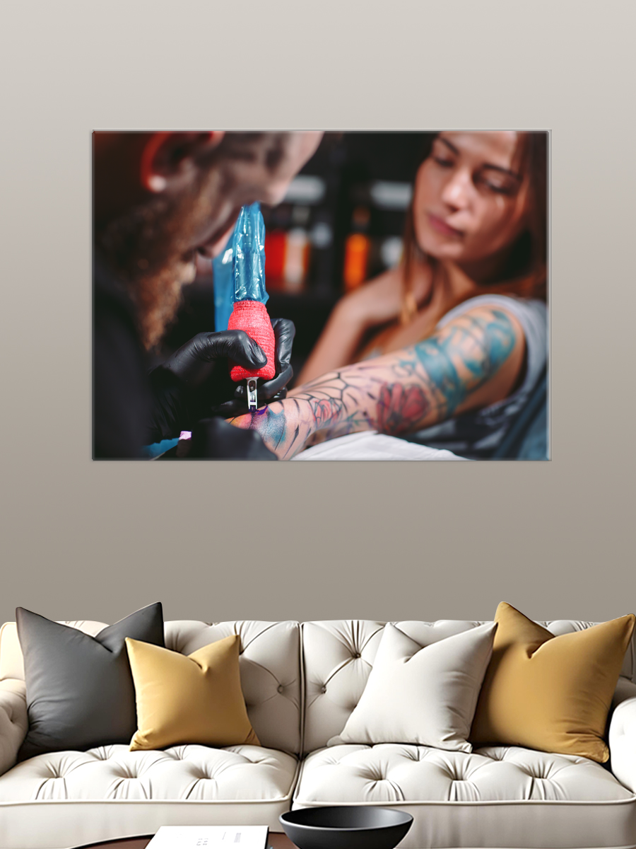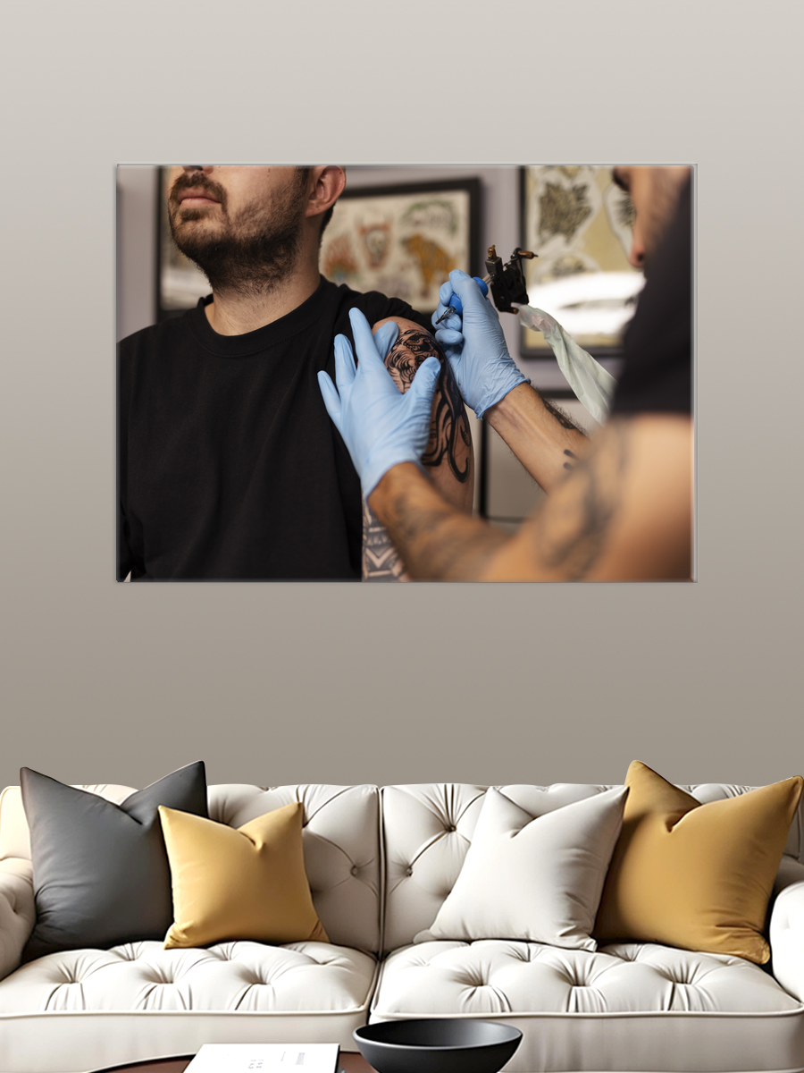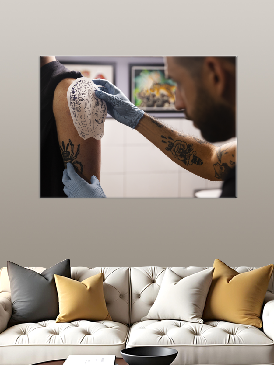 Описание: Картина 50 на 70 "Татуировка на фоне творчества" представляет собой уникальное произведение искусства, в котором запечатлен момент, когда мастер-татуировщик готовит новый дизайн на коже клиента. На переднем плане изображены руки мастера, аккуратно прилаживающие эскиз к руке, украшенной уже существующими татуировками. Основная идея картины заключается в передаче процесса создания индивидуального искусства, который сочетает в себе элементы боли и красоты, самоидентификации и самовыражения. Эта картина вызывает широкий спектр эмоций: от восторга и удивления до чувства глубокой связи с искусством и культурой татуировки. Она может вдохновить зрителя на размышления о собственной индивидуальности и значении татуировок в жизни. Изображение, наполненное динамикой и энергией, создает атмосферу творчества и самовыражения. Картина отлично впишется в интерьер современных пространств, таких как студии, творческие мастерские, а также в дома людей, ценящих оригинальность и индивидуальность. Она станет ярким акцентом в гостиной или кабинете, привнося в атмосферу нотки креативности и вдохновения. Также подойдет для офисов креативных агентств и студий, где ценят нестандартные подходы и артистичность. Эта картина не просто украшение, а настоящая история, которую можно повести с собой в мир искусства.