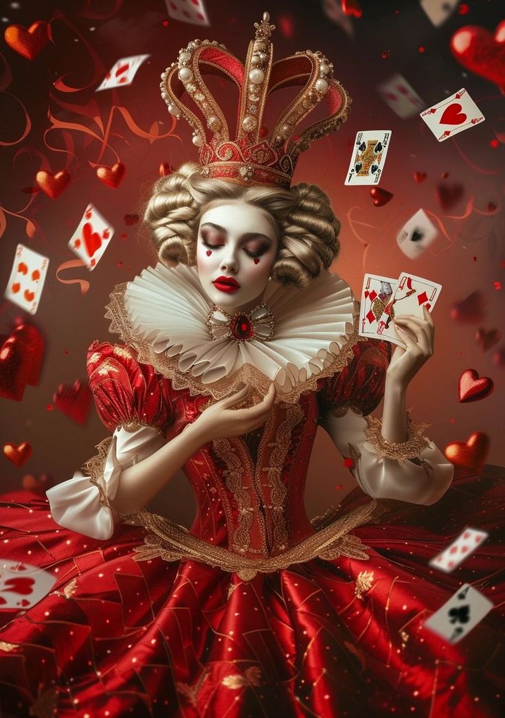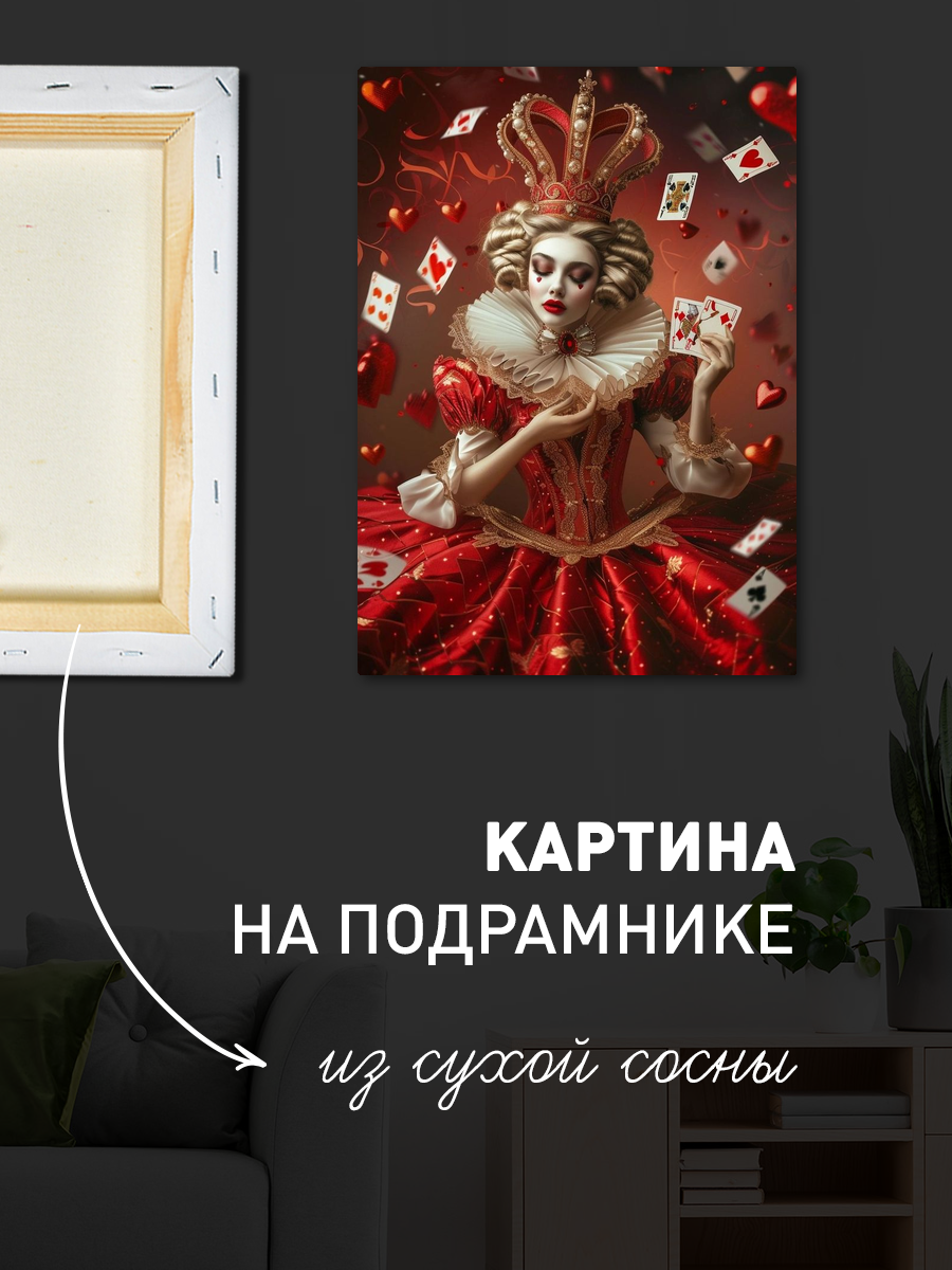 Описание: Картина 50 на 70 "Королева сердец" изображает загадочную и величественную фигуру, одетую в роскошное красное платье с золотыми деталями. На фоне развиваются игральные карты и сердечки, создавая атмосферу волшебства и игры. Эта картина привлекает внимание своей яркой цветовой палитрой и контрастами, что делает её уникальной и запоминающейся. Она передает чувства загадочности и игривости, приглашая зрителя погрузиться в мир фантазий и эмоций. Эта работа станет отличным акцентом в любом интерьере, будь то гостиная, спальня или кабинет. Благодаря своему выразительному дизайну, она прекрасно впишется в стиль ар-деко или современный минимализм, добавляя нотку элегантности и игривости. Повесьте её на стену, и она станет центром притяжения, способствуя интересным беседам и вдохновению. "Королева сердец" не просто картина, а настоящее произведение искусства, которое будет радовать вас и ваших гостей, наполняя пространство положительной энергией и загадкой.