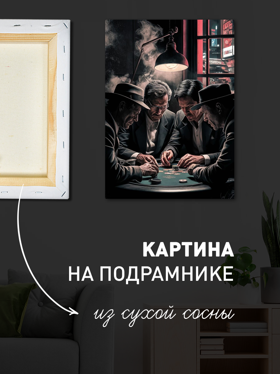 Описание: Картина 50 на 70 "Покерный вечер" изображает захватывающую сцену, где четверо мужчин, одетых в стильные костюмы, сосредоточенно играют в покер при тусклом свете лампы. Вокруг них витает легкий дым, создавая атмосферу напряжения и интриги. Эта картина передает дух азартных игр и соперничества, пробуждая в зрителе желание стать частью этого мира. Уникальность произведения заключается в мастерской игре света и теней, а также в деталях, которые добавляют глубину и объем изображению. Эмоции, которые вызывает эта картина, варьируются от азартного ожидания до глубокого сосредоточения. Она словно приглашает вас присоединиться к игре, ощутить напряжение и волнение, которое витает в воздухе. "Покерный вечер" станет не только стильным акцентом в вашем интерьере, но и источником вдохновения для размышлений о стратегии и удаче. Картина отлично подойдет для кабинета, домашнего бара или игровой комнаты, добавляя в атмосферу нотку элегантности и загадочности. Она будет гармонично смотреться на стене в сочетании с деревянной мебелью или в интерьере в стиле лофт, создавая уникальную атмосферу уюта и стиля.