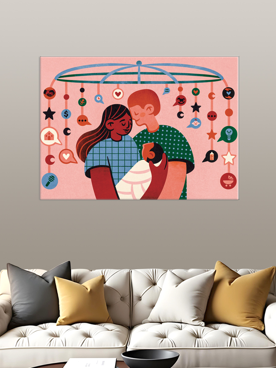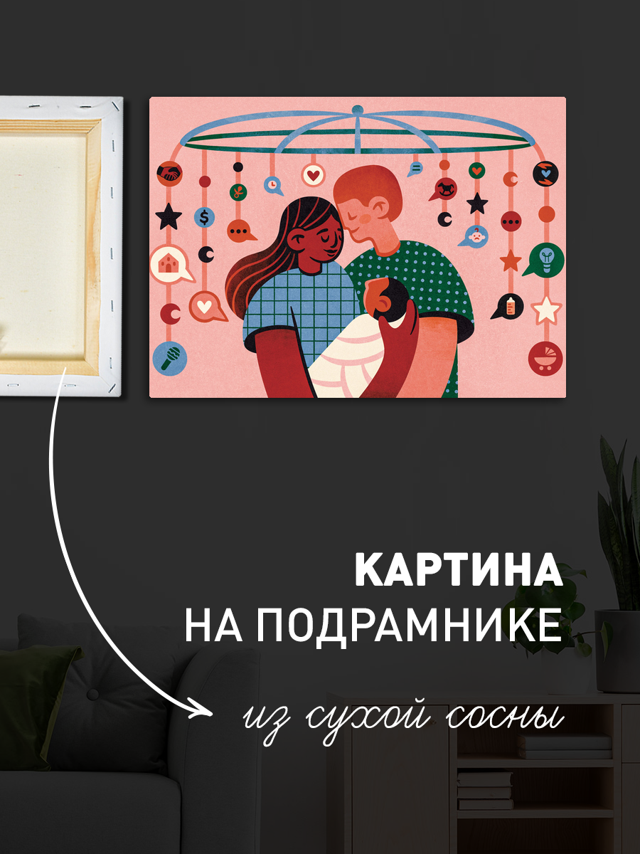 Описание: Картина 50 на 70 "Семейное счастье" изображает трогательный момент, когда любящие родители обнимают своего новорожденного ребенка под уютным мобильным. Яркие, но нежные цвета создают атмосферу тепла и уюта, отражая радость и заботу о новом члене семьи. Основная идея картины заключается в передаче любви и поддержки, которые родители дарят своему малышу в этот важный момент его жизни. Эта картина вызывает светлые и теплые эмоции, наполняя пространство ощущением счастья, безопасности и гармонии. Она может стать истинным украшением любого интерьера, вызывая улыбку и вдохновение у каждого, кто её увидит. Выставленная на стене в детской комнате, гостиной или спальне, картина станет не только стильным акцентом, но и символом семейных ценностей. Отлично подойдет для интерьеров в стиле скандинавском, современном или даже классическом. Яркие цвета и простые формы легко вписываются в любой дизайн, подчеркивая индивидуальность вашего пространства. Разместите картину на уровне глаз, чтобы она стала центром внимания и источником положительных эмоций. Оживите свои стены и создайте атмосферу любви и тепла с этой уникальной картиной.