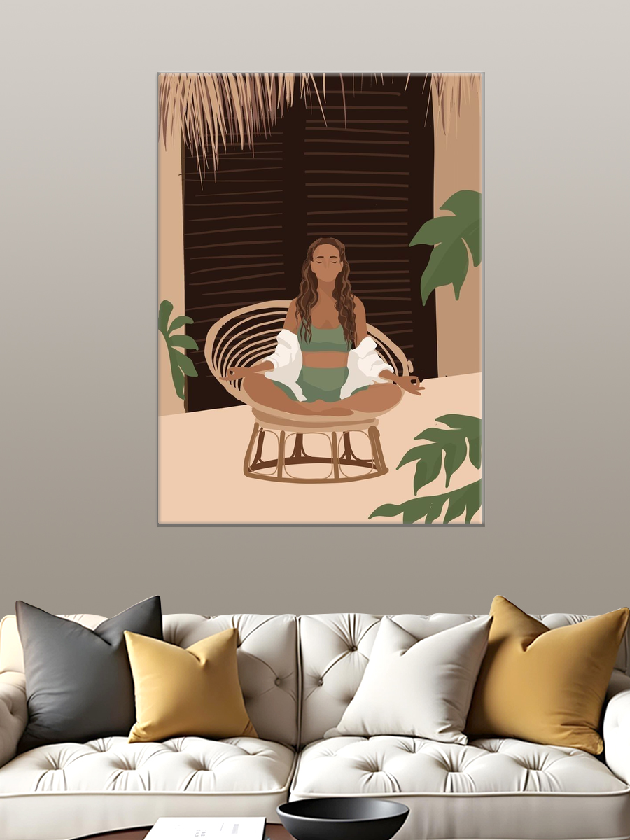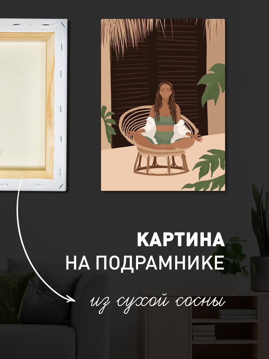 Описание: Картина 50 на 70 "Медитация в тропиках". Эта прекрасная работа изображает женщину, которая в полном спокойствии сидит в позе лотоса на уютном кресле. Ее волосы мягко падают на плечи, а глаза закрыты, что создает атмосферу умиротворения и внутреннего покоя. Основная идея картины - показать важность медитации и гармонии с природой. Уникальный стиль исполнения, выполненный в теплых и мягких тонах, добавляет в работу ощущение легкости и расслабления. Эта картина вызывает сильные положительные эмоции, такие как спокойствие и вдохновение. Она станет прекрасным дополнением к любому интерьеру, преобразив пространство, наполненное стресом и суетой. Представьте, как она будет смотреться в вашем уютном уголке для чтения или в спальне, создавая атмосферу спокойствия и расслабления. Картина идеально подойдет для интерьеров в стиле бохо, эклектики или минимализма. Она будет прекрасно смотреться на стене в гостиной, создавая теплую и дружелюбную атмосферу, или в кабинете, помогая вам сосредоточиться на работе. Также её можно разместить в студии йоги или медитации, где она станет источником вдохновения и умиротворения для практикующих. Добавьте в свой дом кусочек тропической идиллии с этой картиной, которая будет напоминать вам о важности гармонии и внутреннего покоя в повседневной жизни.