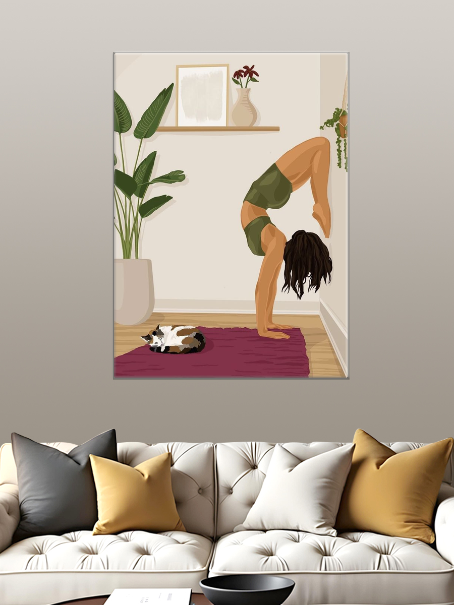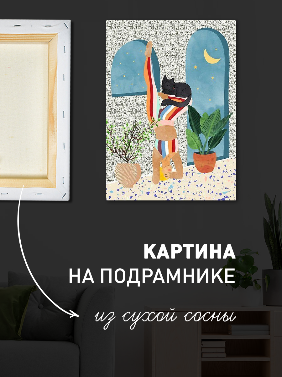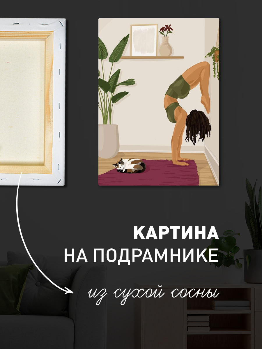 Описание: Картина 50 на 70 "Йога и умиротворение" представляет собой изящное изображение женщины, выполняющей асану йоги у стены, с уютным котом, мирно спящим на мягком ковре. Эта картина передает атмосферу спокойствия и гармонии, подчеркивая важность внутреннего мира и баланса в повседневной жизни. Каждый элемент картины тщательно продуман: мягкие цвета и плавные линии создают ощущение умиротворения. Женщина в позе на руках символизирует силу и грацию, а котик добавляет уют и тепло в общую композицию. Эта картина поможет вам сосредоточиться на своем внутреннем состоянии и вдохновит на практику йоги и медитации. Она будет прекрасно смотреться в спальне или в кабинете, создавая атмосферу спокойствия и уюта. Также картина станет отличным дополнением к пространству, где вы занимаетесь йогой или медитацией, визуально поддерживая ваше стремление к гармонии. Подвесив ее в гостиной, вы удивите гостей и создадите непринужденную, расслабляющую атмосферу. Эта работа станет не только элементом декора, но и источником вдохновения для вас и ваших близких.
