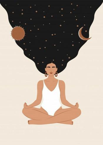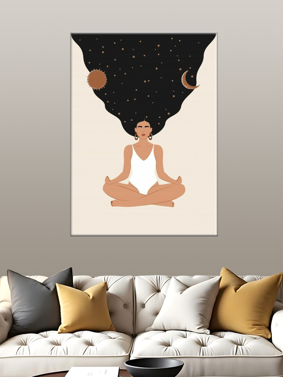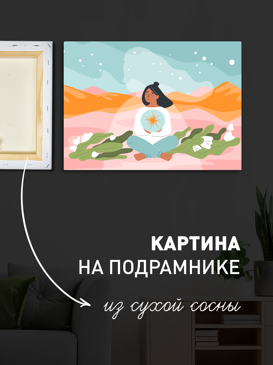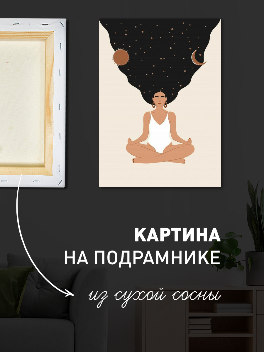 Описание: Картина 50 на 70 "Медитация под звёздами" – это уникальное произведение искусства, которое погружает зрителя в мир гармонии и спокойствия. На холсте изображена женщина в позе лотоса, у которой длинные черные волосы, словно вселенная, растекаются вокруг неё. На фоне звёзды, луна и солнечные тела, символизирующие единство человека с космосом. Эта картина наполнена глубокой смысловой нагрузкой: она напоминает о важности внутреннего мира и умиротворения. Каждый взгляд на эту картину вызывает чувство спокойствия и вдохновения, позволяя вам отвлечься от повседневной суеты и сосредоточиться на единении с собой и окружающим миром. Она станет отличным акцентом в вашем интерьере, привнося в него нотки уюта и гармонии. Картина идеально впишется в спальню, гостиную или кабинет, создавая атмосферу спокойствия и умиротворения. Также её можно разместить в йога-студии или медитационном пространстве, где она станет источником вдохновения для практикующих. Окружите себя красотой и гармонией с этой удивительной картиной!