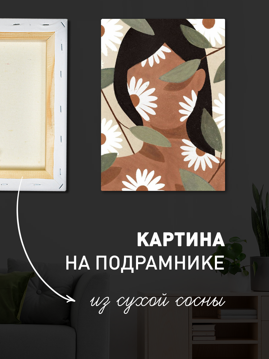 Описание: Картина 50 на 70 "Лицо природы" представляет собой уникальное сочетание абстрактного портрета и цветочного оформления. На изображении мы видим силуэт женщины, чье лицо частично скрыто за белыми ромашками и зелеными листьями, что создает ощущение единства с природой. Эта картина передает атмосферу гармонии и спокойствия, приглашая зрителя задуматься о красоте окружающего мира. Эмоции, которые вызывает данное произведение, варьируются от умиротворения до легкой ностальгии. Оно напоминает о теплом летнем дне, когда природа расцветает во всей своей красе. Благодаря мягким цветам и простым формам, картина создаёт уютную атмосферу, которая может стать центром внимания в любой комнате. Эта работа идеально впишется в интерьер, оформленный в стиле минимализма, бохо или даже скандинавском дизайне. Она прекрасно подойдет для гостиной, спальни или рабочего кабинета, придавая пространству нотки тепла и натуральности. Повесив её на стену, вы создадите атмосферу, способствующую расслаблению и вдохновению. "Лицо природы" — это не просто картина, это приглашение к размышлению и наслаждению каждым моментом жизни.