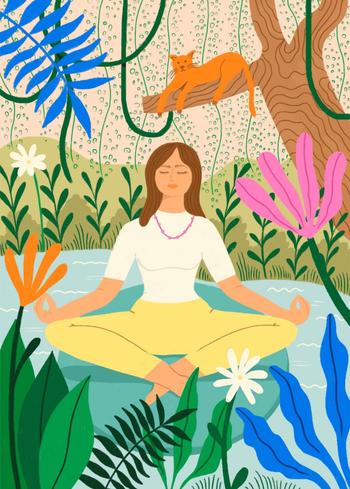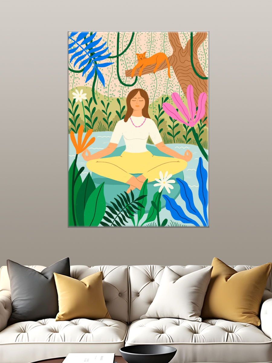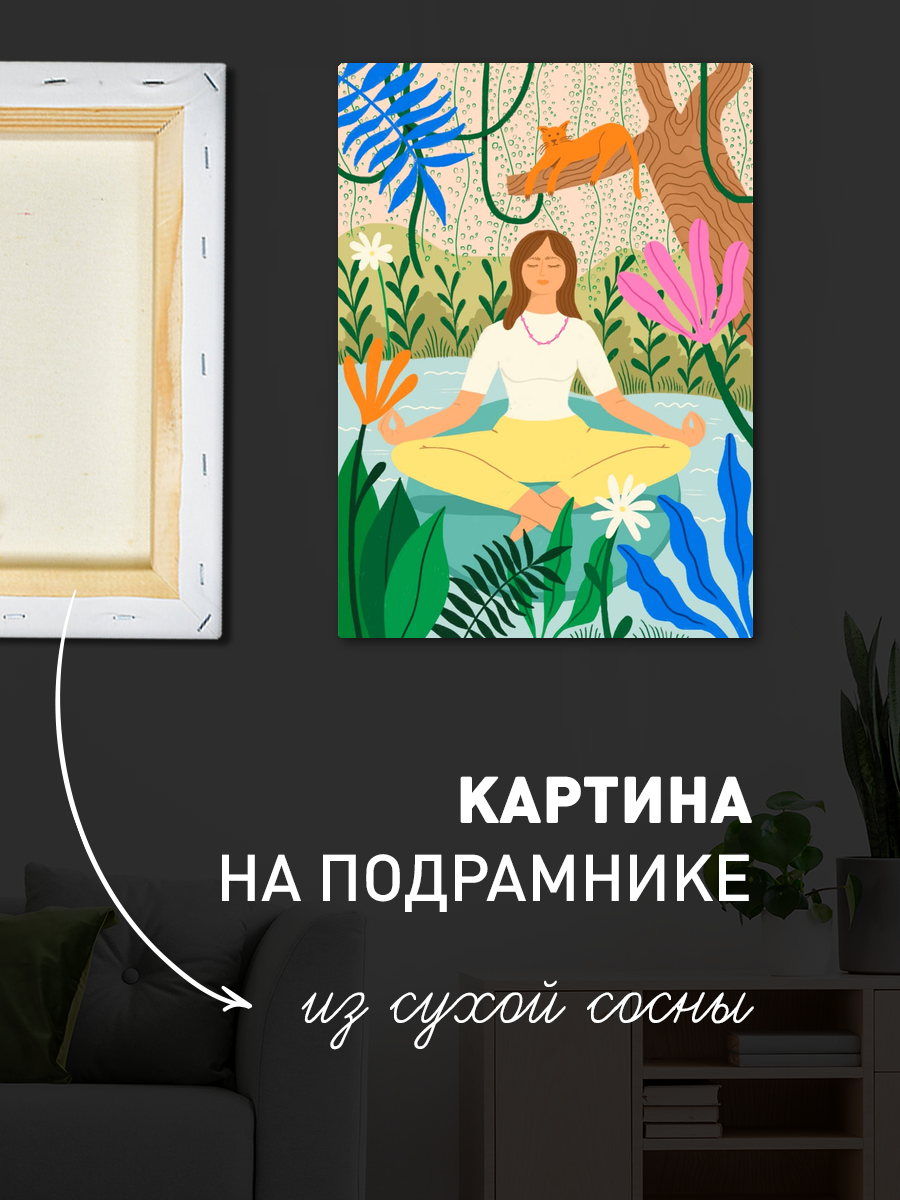 Описание: Картина 50 на 70 "Медитация в природе" - это великолепное изображение, которое переносит зрителя в мир гармонии и спокойствия. На картине изображена женщина в позе лотоса, уютно расположившаяся на берегу спокойного водоема, окруженного яркими цветами и зелеными растениями. В верхней части картины можно увидеть ленивого кота, который наблюдает за происходящим, добавляя элемент уюта и домашнего тепла. Основная идея картины заключается в внутреннем покое и гармонии с природой. Она передает атмосферу умиротворения и глубокого саморазмышления, что делает её идеальным дополнением для любого пространства, где требуется создать атмосферу спокойствия. Уникальность данной работы заключается в её ярких цветах и детализированном исполнении, которые привлекают внимание и поднимают настроение. Эта картина вызывает нежные и умиротворяющие эмоции, наполняя пространство светом и позитивом. Она прекрасно подойдет для спальни, кабинета или любого другого места, где важно создать атмосферу для отдыха и медитации. Также картина будет отличным подарком для людей, увлекающихся йогой, медитацией или просто ценящих красоту природы. Размещение картины на стене сделает ваш интерьер более уютным и стильным, а яркие цвета добавят жизни в любое помещение. Не упустите возможность украсить своё пространство этим произведением искусства, которое вдохновляет и дарит гармонию.