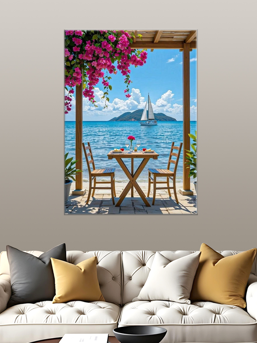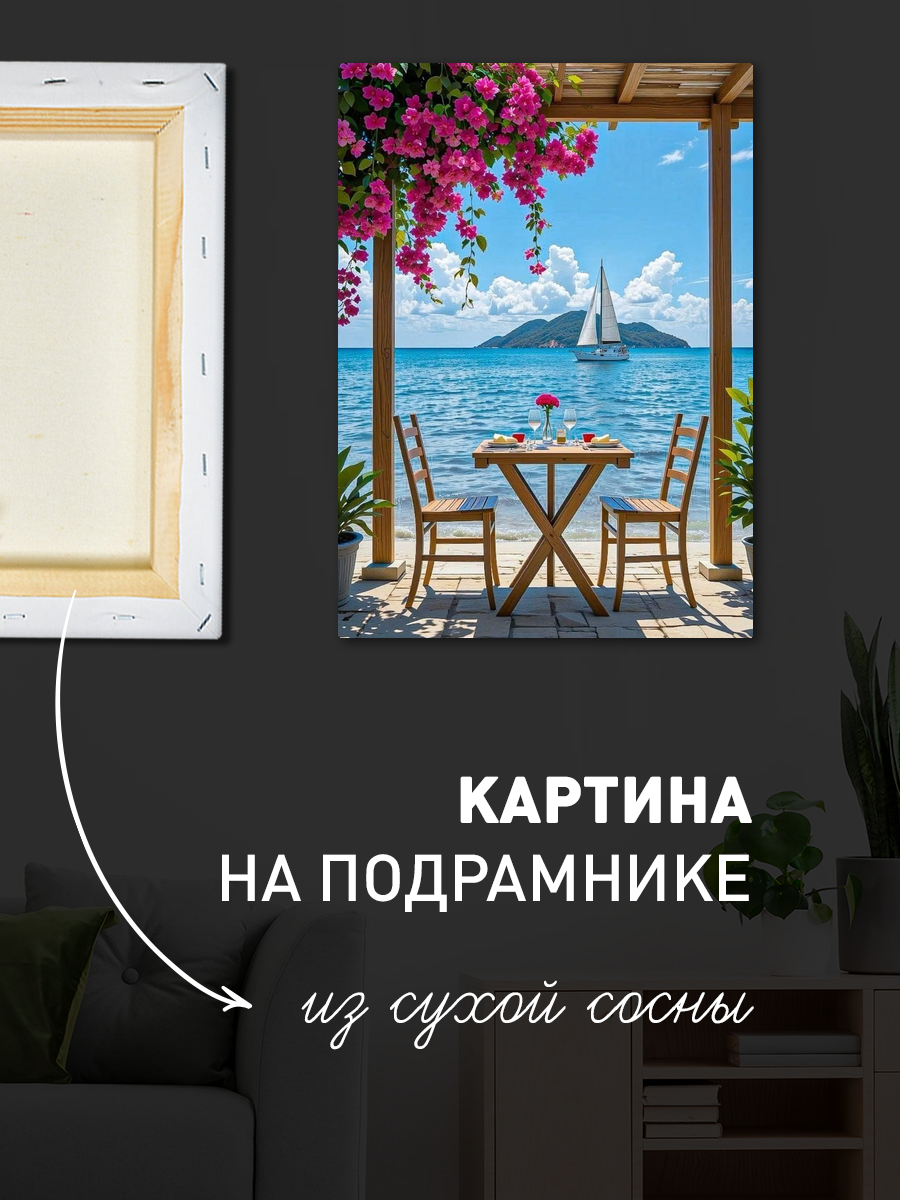 Описание: Картина 50 на 70 "Летняя идиллия" изображает живописный пейзаж с уютной обстановкой на берегу моря. На переднем плане расположены два деревянных стула и стол, накрытый для романтического ужина. Яркие цветы, свисающие с перголы, создают атмосферу уюта и радости. На горизонте виден белоснежный парусник, плывущий по спокойным голубым водам, что придаёт картине динамичность и жизнь. Эта картина вызывает чувства спокойствия и счастья, напоминая о летних днях, проведённых на пляже, и романтических вечерах с близкими. Яркие цветовые акценты, такие как розовые цветы и голубое море, наполняют пространство энергией и позитивом, создавая при этом атмосферу расслабления. Картина отлично впишется в интерьер кухни, столовой или гостиной, а также станет ярким акцентом в спальне. Она идеально подходит для тех, кто хочет создать уютное и современное пространство, наполненное светом и радостью. "Летняя идиллия" станет не только украшением вашего дома, но и источником вдохновения, напоминая о том, как важно наслаждаться каждым моментом жизни.