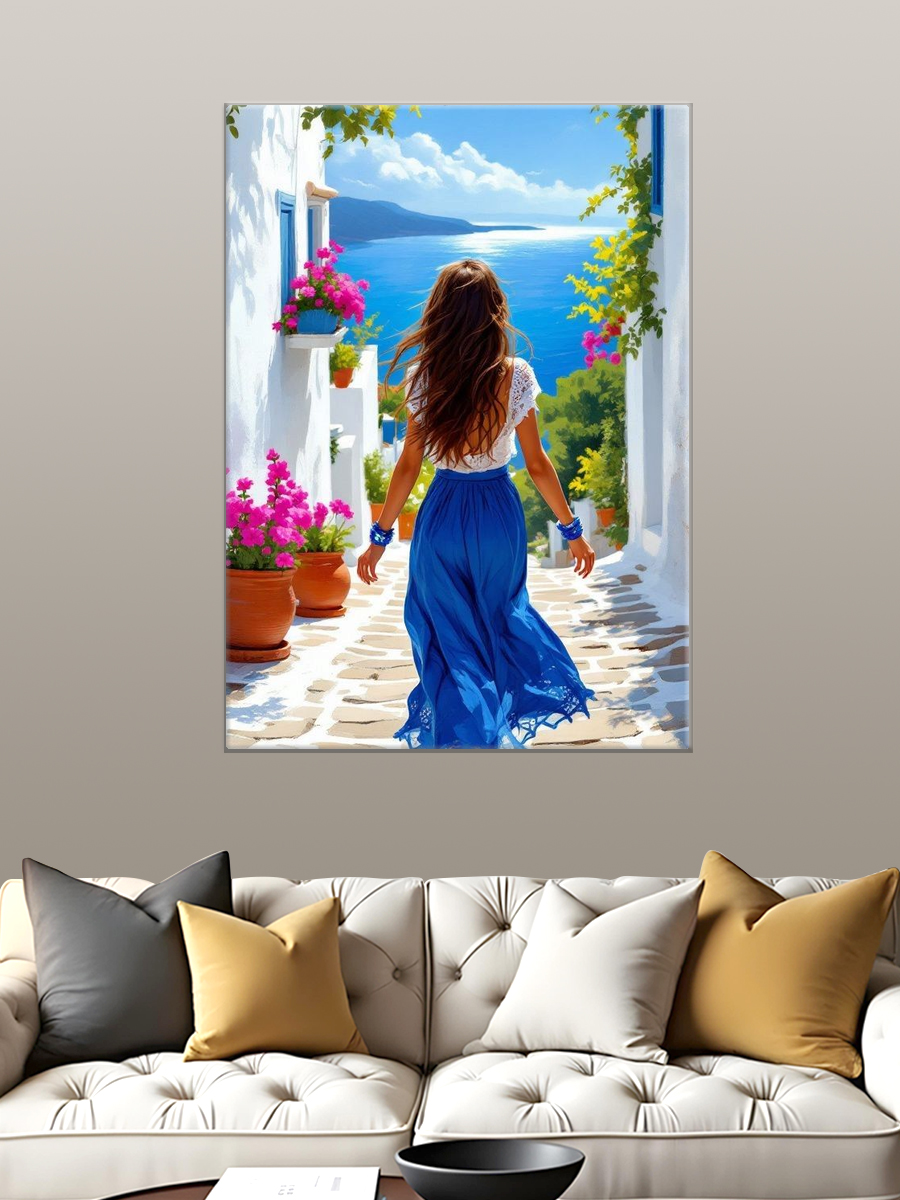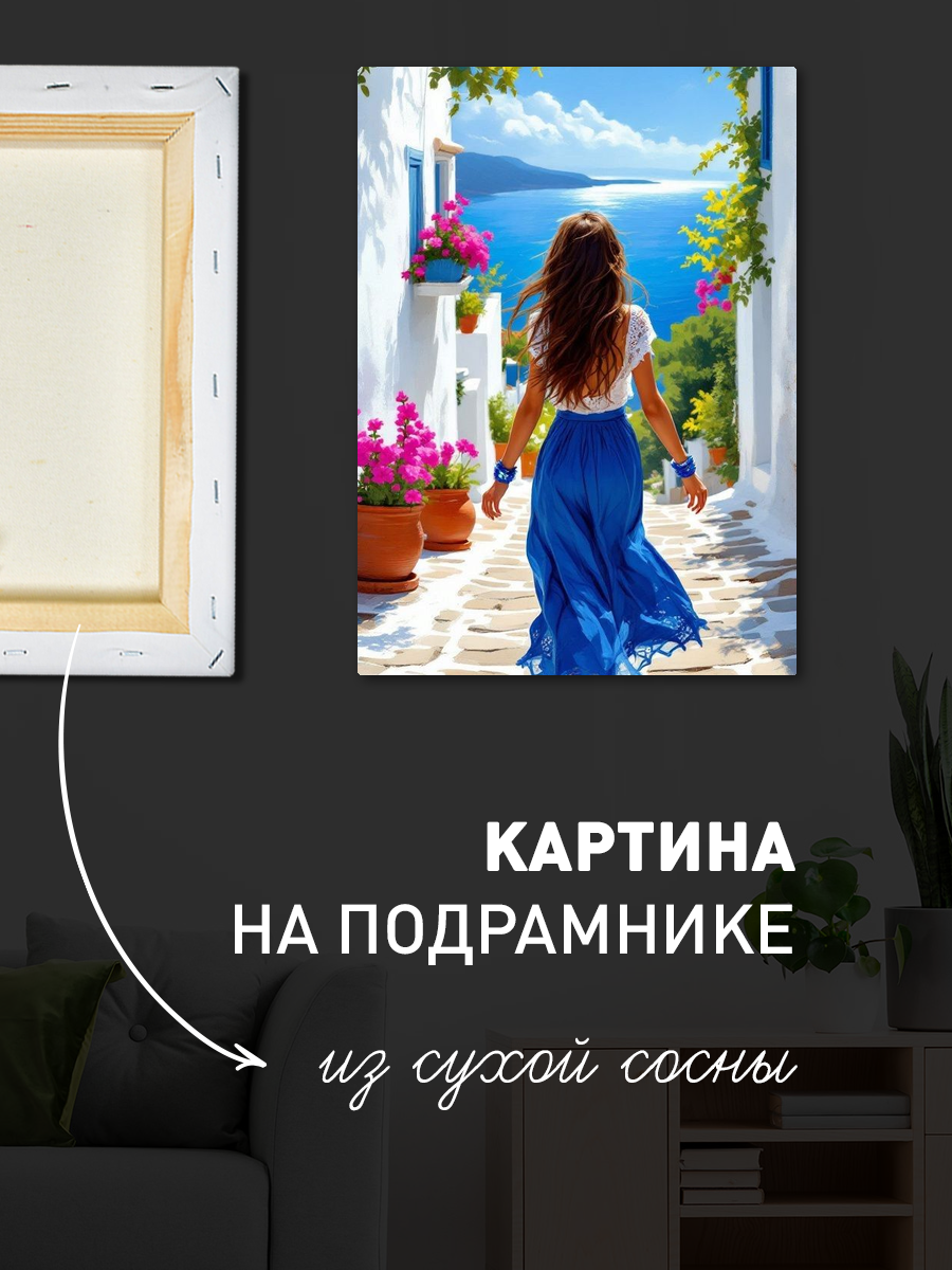 Описание: Картина 50 на 70 'Солнечный Пейзаж'. Эта живописная работа переносит зрителя в уютную улочку, где белоснежные дома, обрамленные зеленью, ведут к бескрайнему голубому морю. На переднем плане девушка в легком платье, идущая по каменной дорожке, создает атмосферу свободы и безмятежности. Уникальность этой картины заключается в ее способности вызвать чувство спокойствия и гармонии, наполняя пространство легкостью и свежестью. Она идеально подойдет для интерьеров в морском или провансальском стиле, а также станет ярким акцентом в современных минималистичных помещениях. Повесьте её в гостиной, спальне или даже в кабинете, и она наполнит ваше пространство позитивной энергией и вдохновением. Эта картина станет не только украшением вашего дома, но и источником приятных эмоций и воспоминаний о летних днях у моря.