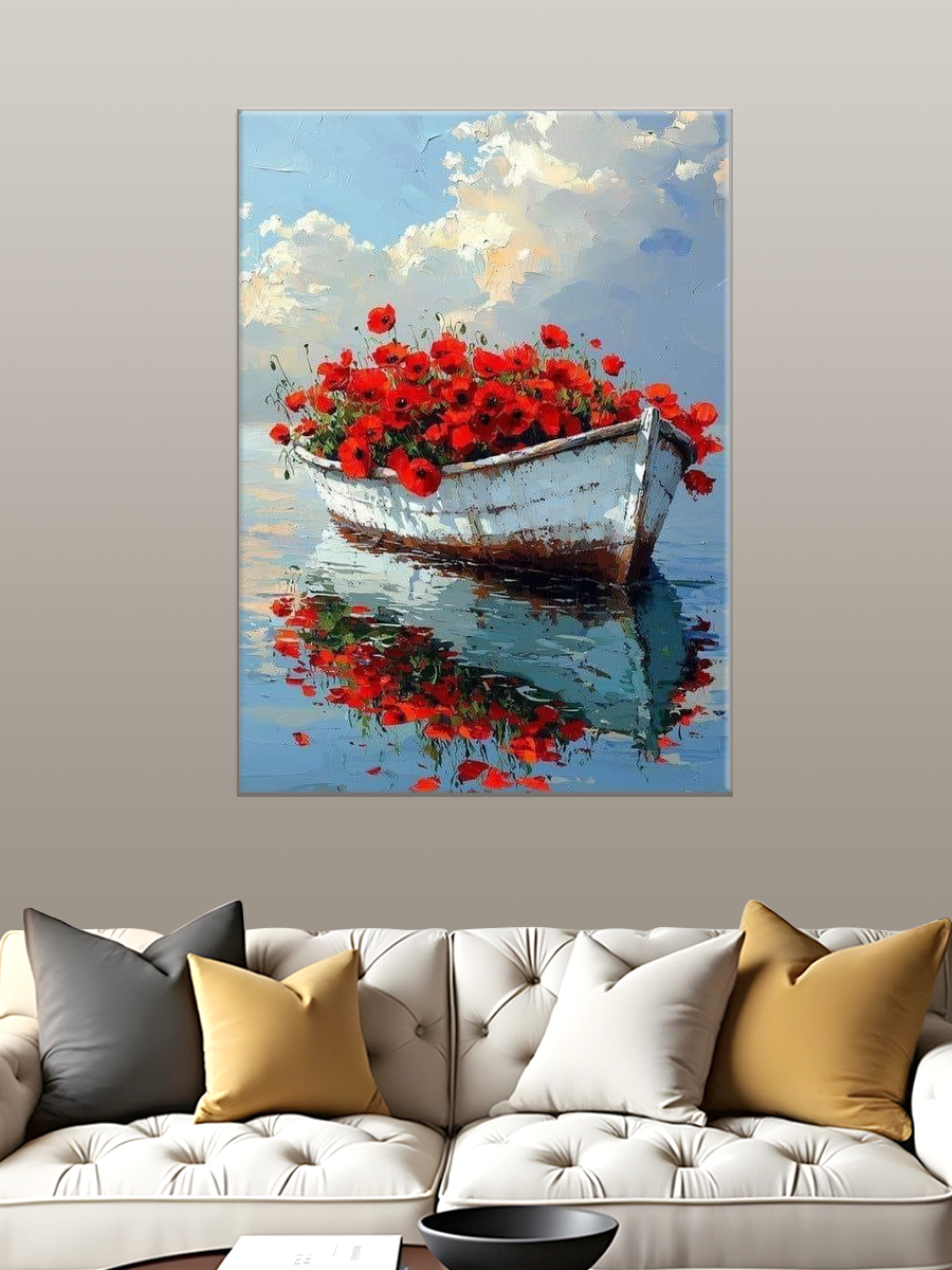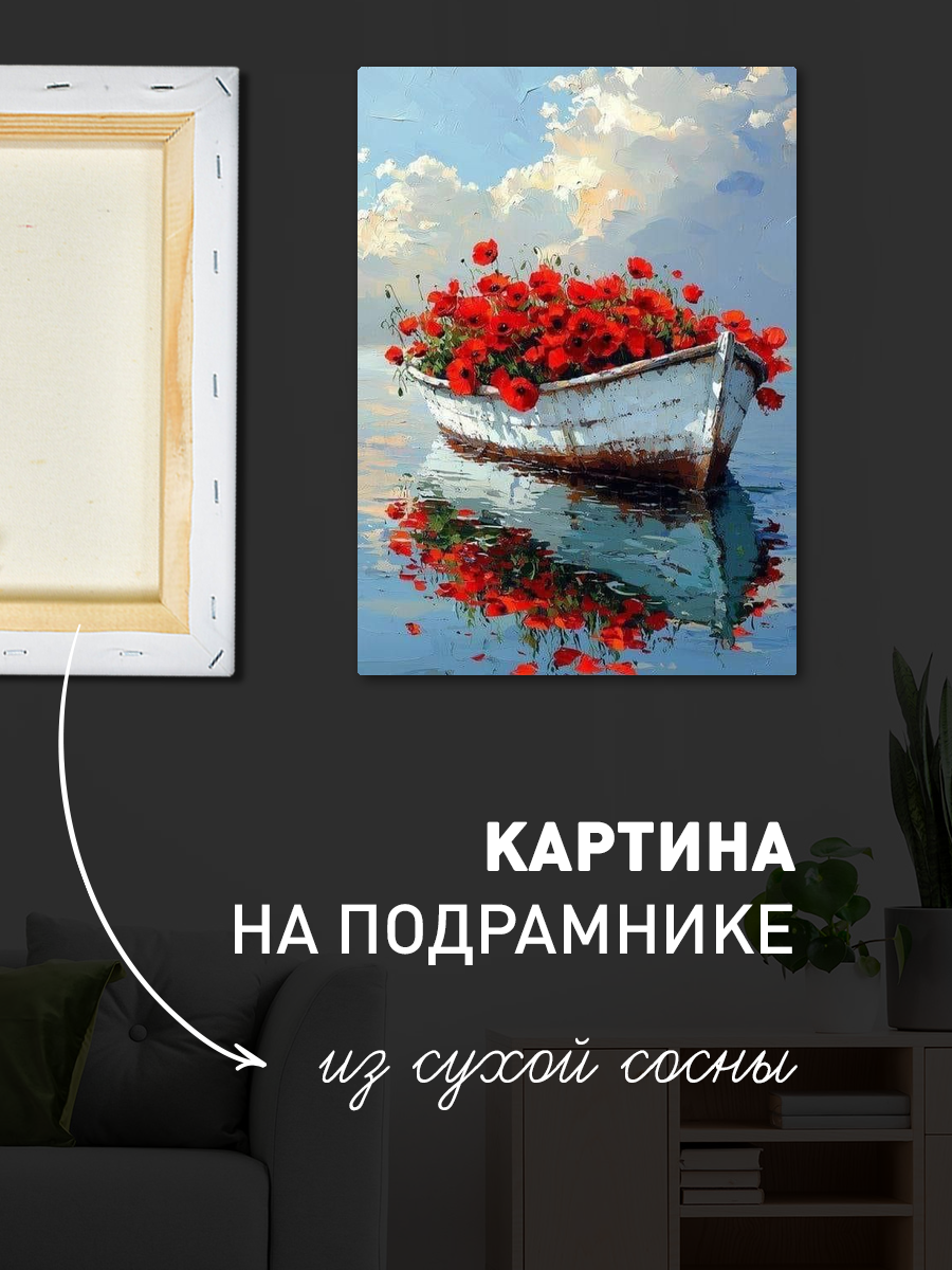 Описание: Картина 50 на 70 "Цветы в лодке" погружает зрителя в атмосферу спокойствия и гармонии. На полотне изображена старая деревянная лодка, наполненная яркими красными маками, которые словно выпрыгивают из нее, создавая эффект живого цветка. Нежный голубой фон с облаками добавляет легкости и мечтательности, подчеркивая красоту цветов. Эта картина вызывает теплые чувства, наполняя пространство яркостью и позитивом. Она станет прекрасным акцентом в любом интерьере, будь то уютная гостиная, светлая кухня или даже кабинет. Она идеально подойдет для тех, кто ценит живопись, вдохновленную природой, и хочет привнести в свой дом частичку летнего настроения. Разместите эту картину на стене, и она будет радовать ваш взгляд и поднимать настроение каждый день.