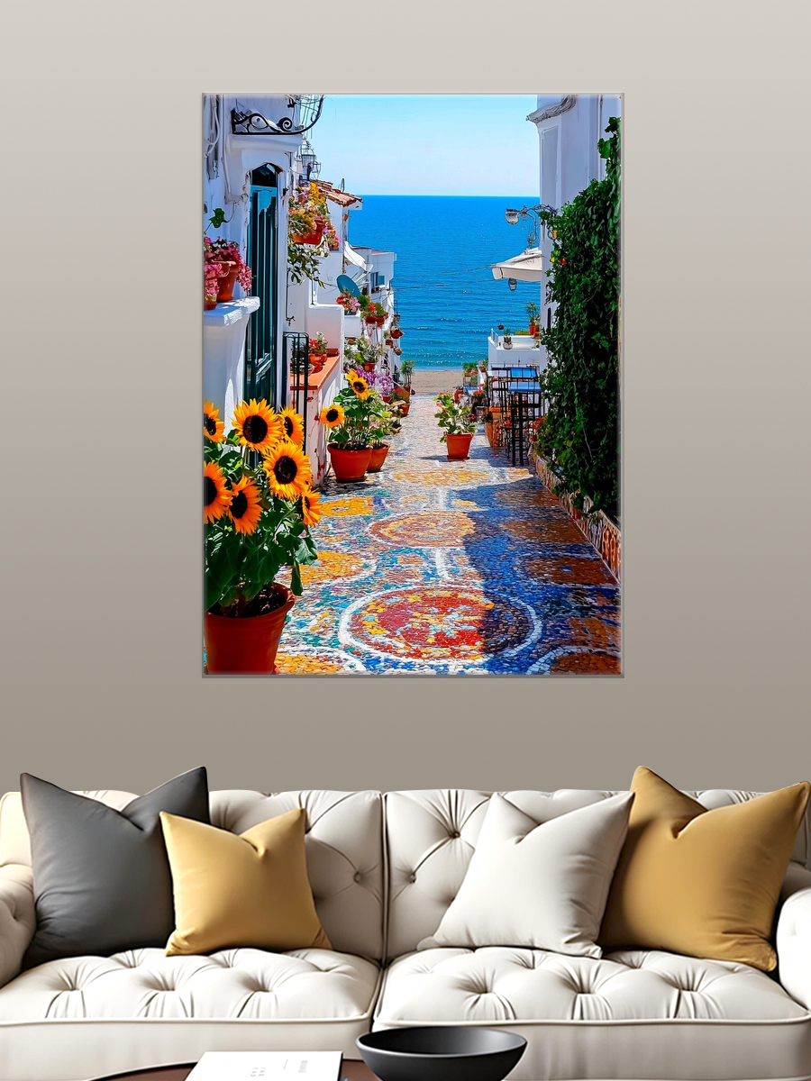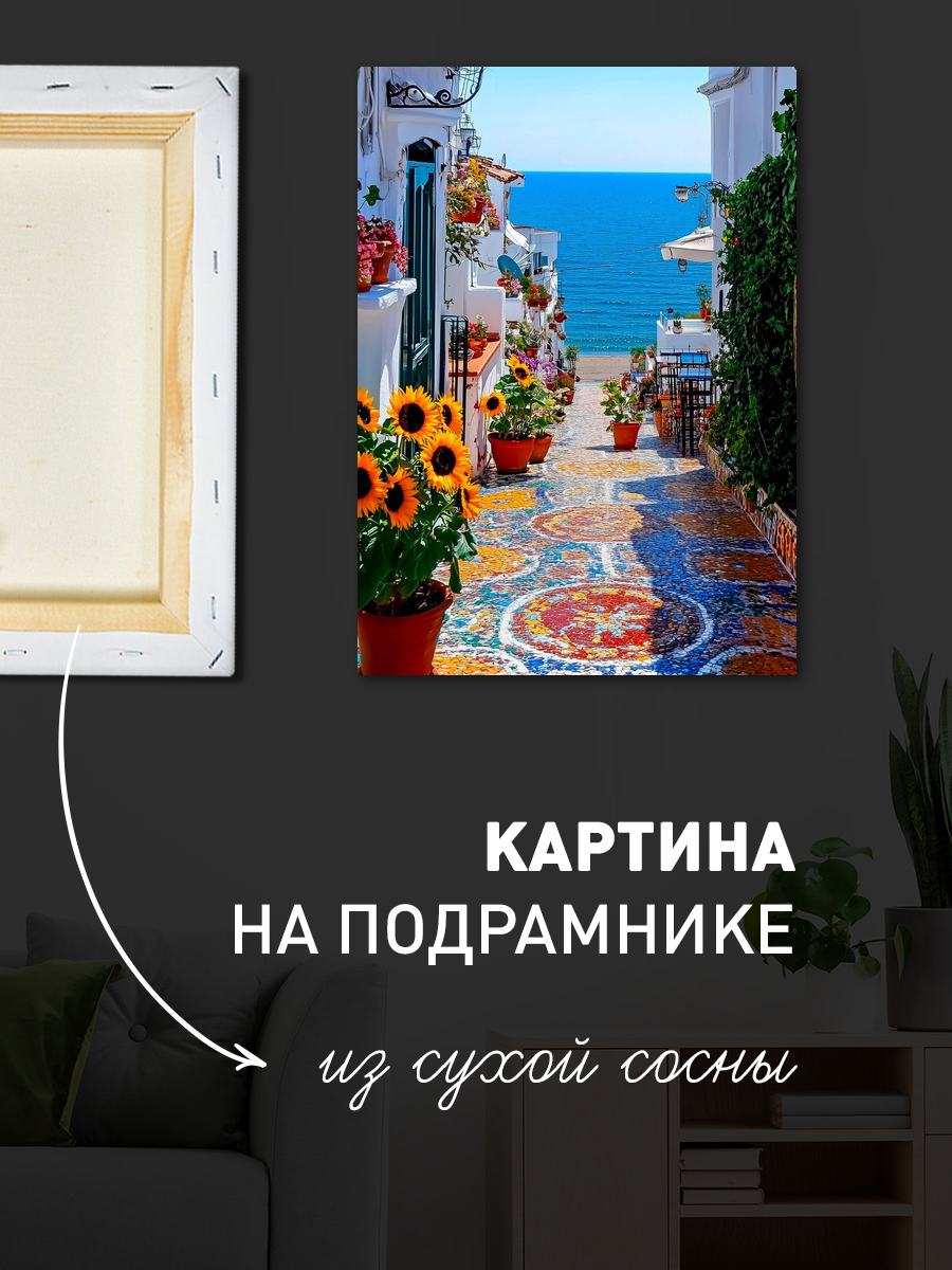 Описание: Картина 50 на 70 "Солнечная улочка у моря" воплощает в себе атмосферу летнего отдыха и спокойствия. На полотне изображена живописная улочка, вымощенная яркими мозаичными плитками, обрамленная цветущими горшками с подсолнечниками и другими цветами. На заднем плане открывается безмятежный вид на синее море, которое гармонично сливается с ясным небом. Уникальность данной картины заключается в её способности переносить зрителя в мир тепла и радости, вызывая ностальгию по летним дням и воспоминаниям о путешествиях. Эта картина наполнена светом и цветом, что делает её идеальным акцентом для любого интерьера. Она станет прекрасным дополнением как для уютной гостиной, так и для стильного кабинета или спальни, добавляя нотку свежести и гармонии. Визуальная легкость и жизнерадостность картины создадут атмосферу уюта и спокойствия в вашем пространстве. Повесьте её на стену, и она будет радовать вас и ваших гостей, напоминая о солнечных днях и беззаботных моментах жизни.